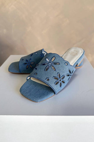 Oasis Society - Women's Manila Denim Eyelet Flower Heel Sandals