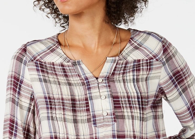 Relaxed fit; hits at hip|Designed to fit and flatter 5'4" and under frame|Split neckline; button closures at half placket|Pintuck pleats at bodice|Long sleeves with elastic cuffs