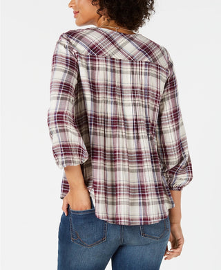 Style & Co Women's Plaid Pleated Top Purple Size Petite Medium