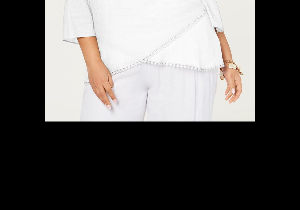 Life can be a beach in JM Collection's breezy plus size crochet-trim top| with flattering crossover styling and a removable chain necklace that adds sophisticated polish.| Relaxed fit; hits at hip| Scoop neckline with removable chain necklace| Pleated back yoke; crochet trim at crossover front hem| 3/4-sleeves with crochet-trim bell-shaped cuffs
