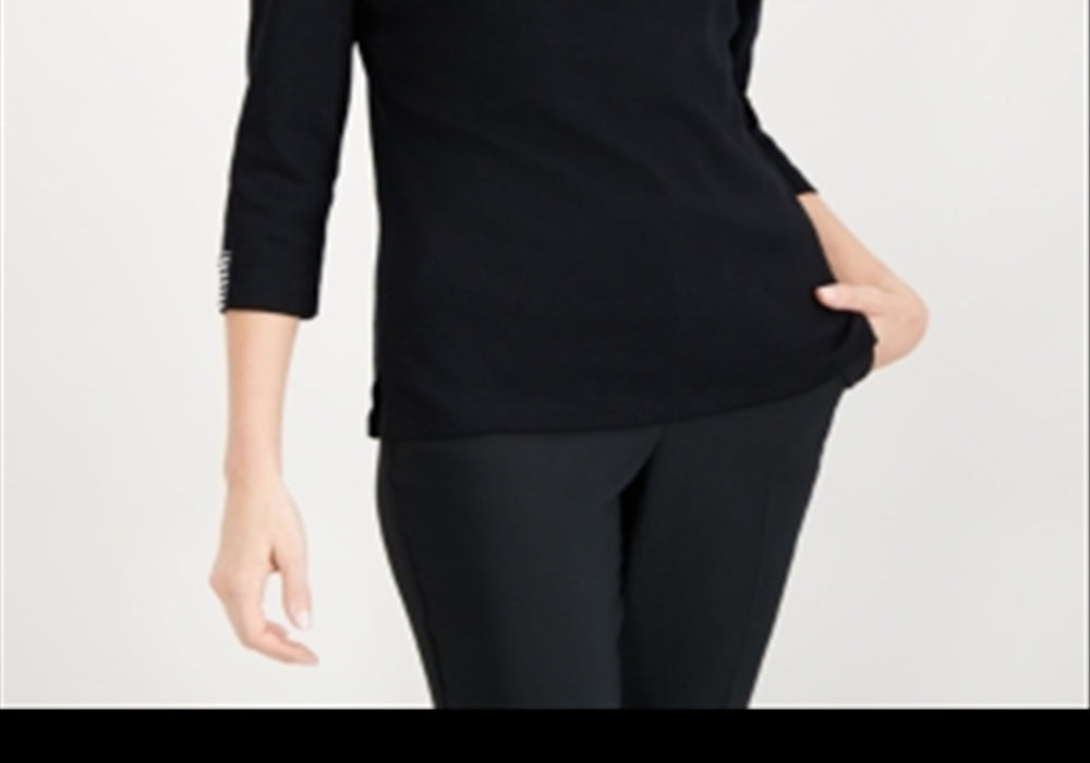 Keep your casual style updated with effortless appeal in this Karen Scott cotton top with a contrasting neckline inset and grommet trim.| Hits at hip; approx. 26 long| Due to generous sizing| we suggest sizing down for the perfect fit| Split neckline with contrasting striped inset| Grommet trim at neckline; striped detail at cuffs| 3/4-sleeves