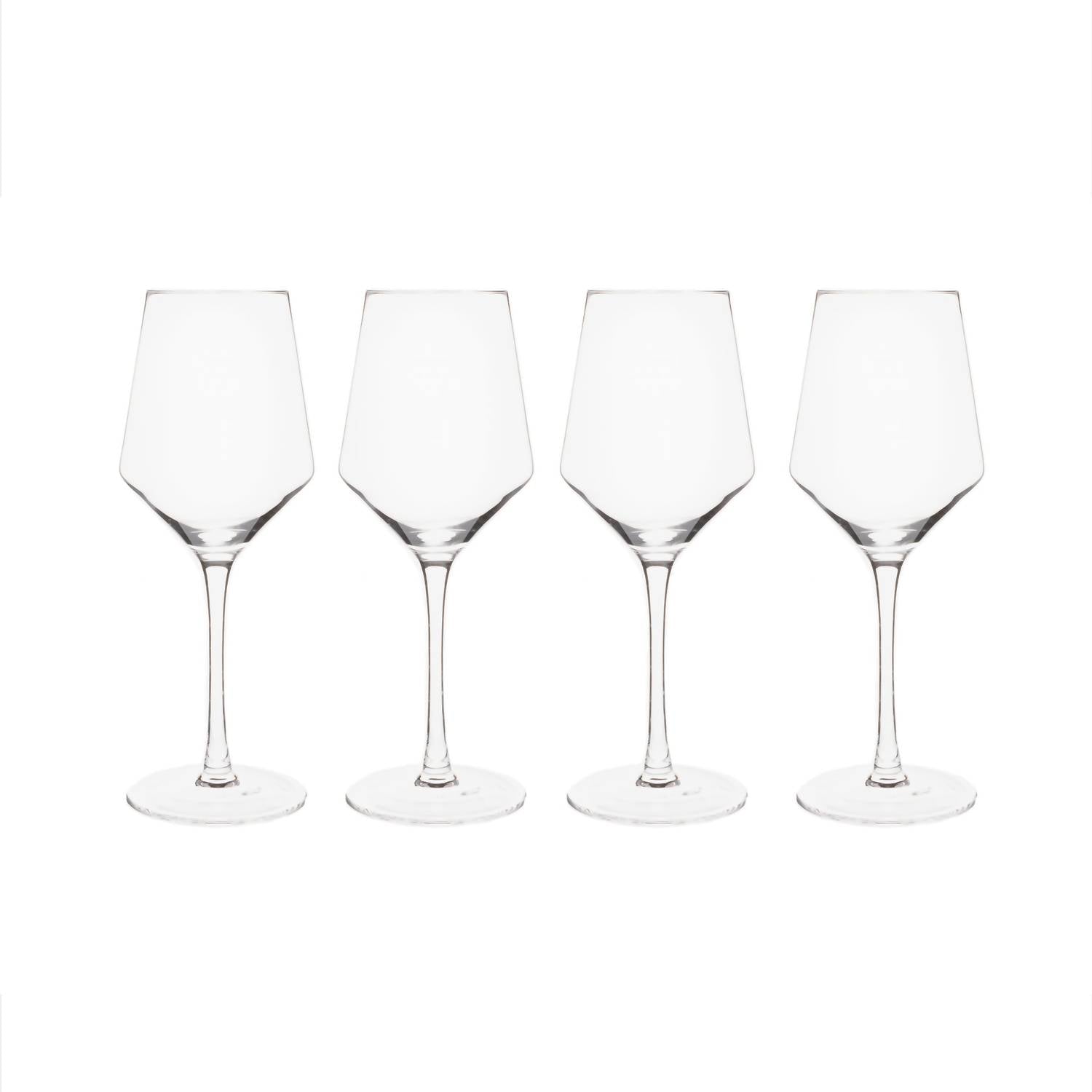 Set of four white wine glasses. 14 oz capacity, perfect for savoring your favorite white wines. Modern and versatile design for various occasions. Premium glass construction for clarity and durability.