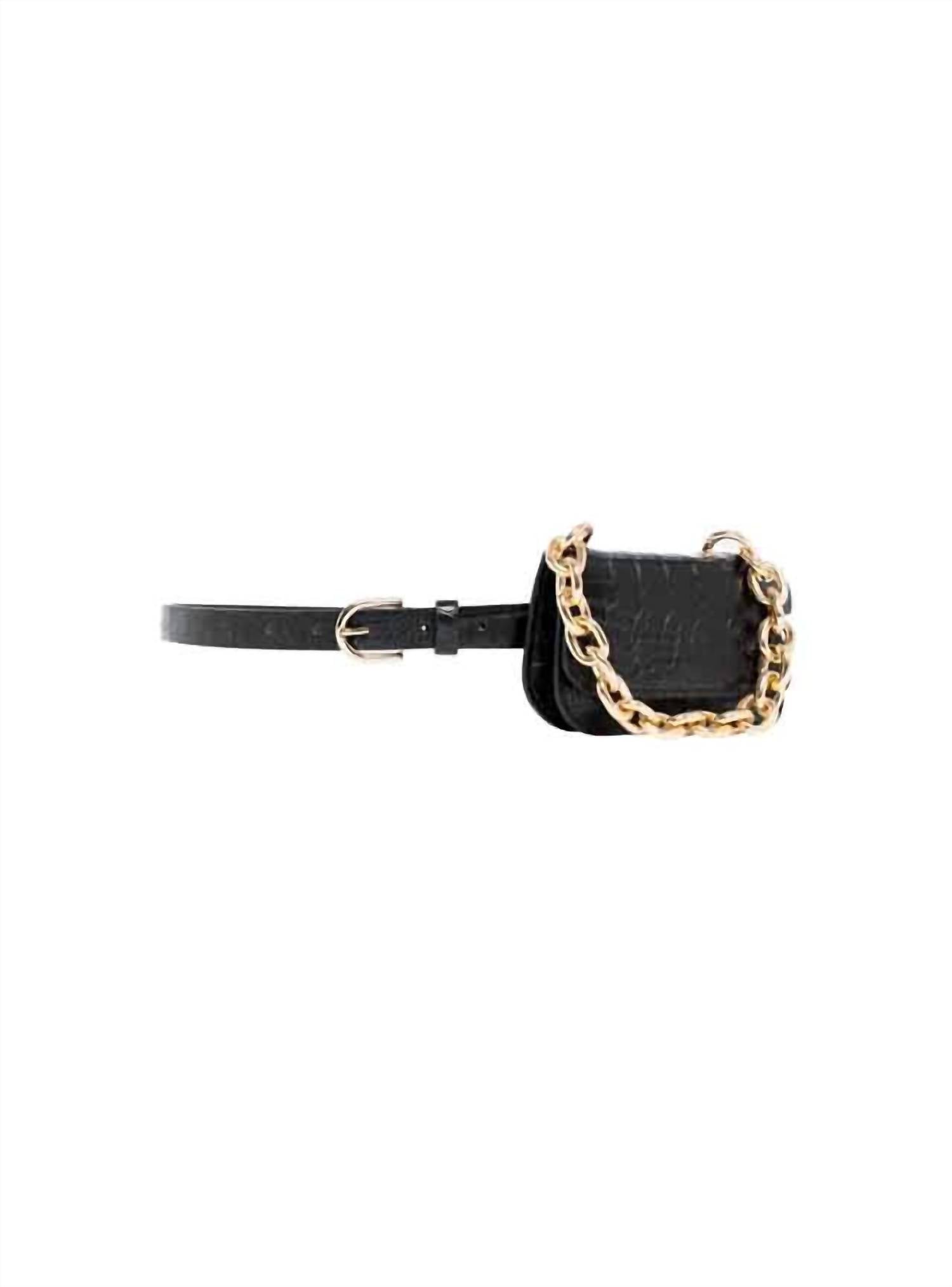 Introducing the Crocodile Belt Purse by Giorgia & Johns, a chic accessory crafted from black vegan leather with a captivating crocodile print. This stylish belt features a removable bag adorned with a decorative chain, offering versatility in how you wear it. It stands at a convenient height of 2 cm and is made from 100% PU, ensuring durability and a sleek finish. Elevate your outfit with this fashionable and functional piece.