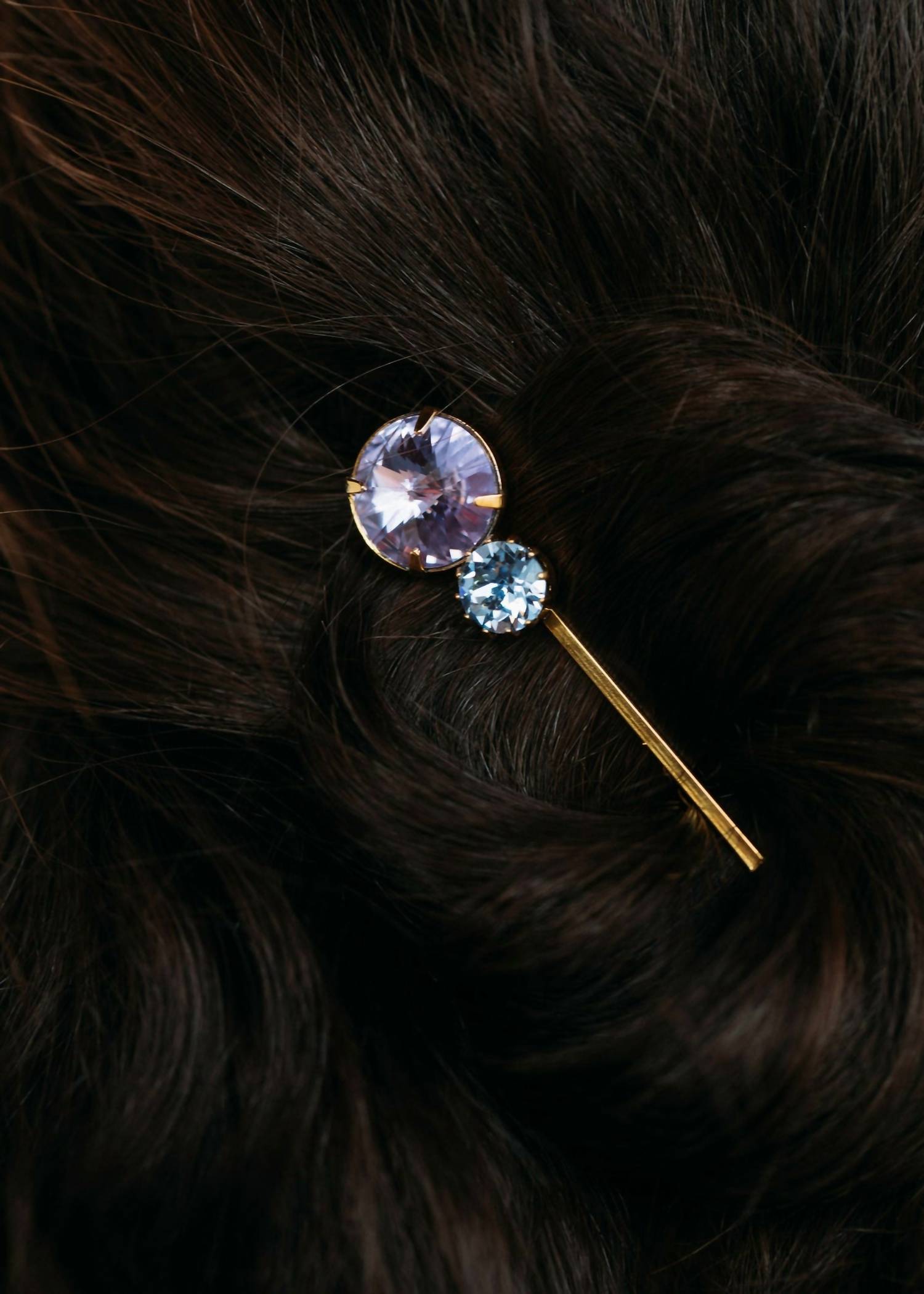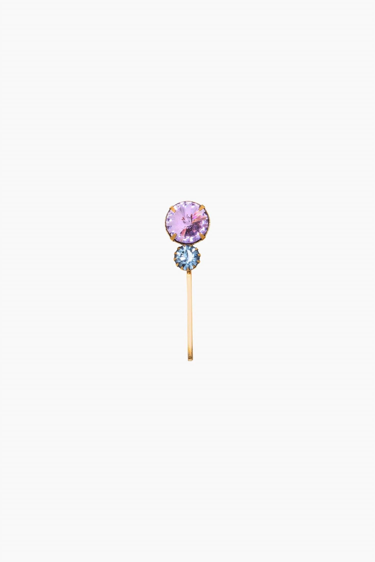 Introducing the Myrla Bobby Pin by Jennifer Behr, an exquisite hair accessory perfect for adding a touch of elegance. Made in New York, this piece features a composition of colorful crystals on a light antique gold-plated pin designed for a secure hold. Treat it like fine jewelry, avoiding contact with water, perfume, and hairspray to maintain its beauty. Elevate your hairstyle with this sophisticated bobby pin and create a unique look that's truly your own.