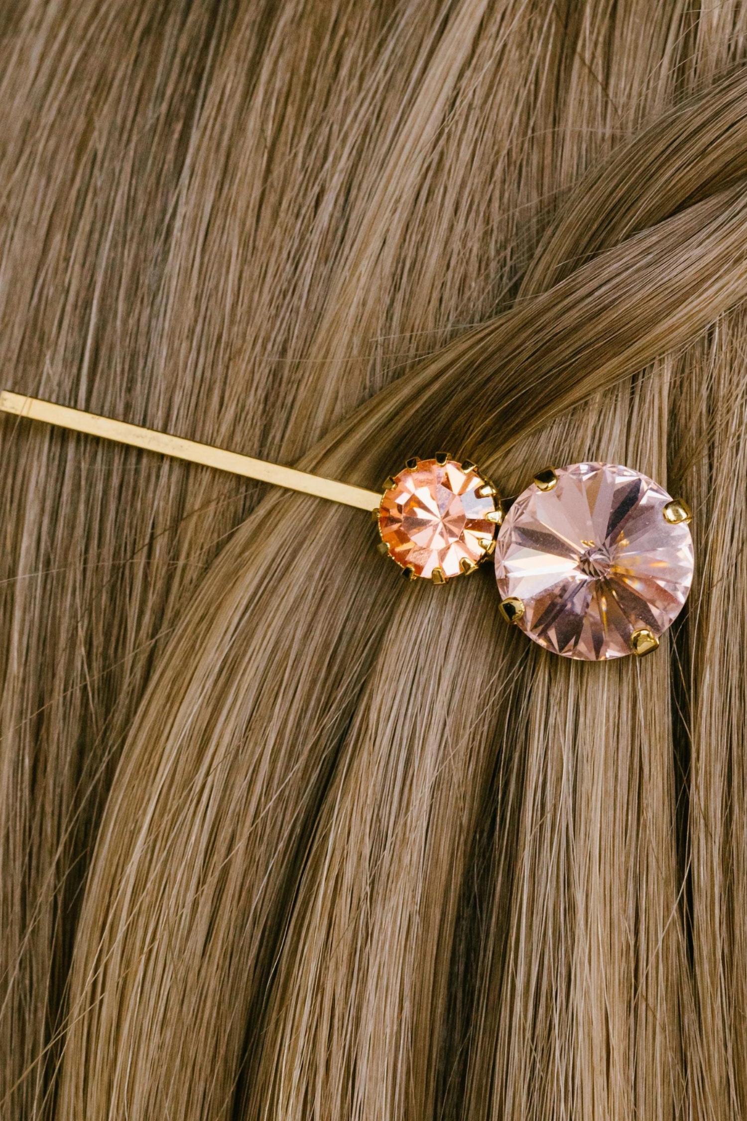 Introducing the Myrla Bobby Pin by Jennifer Behr, an exquisite hair accessory perfect for adding a touch of elegance. Made in New York, this piece features a composition of colorful crystals on a light antique gold-plated pin designed for a secure hold. Treat it like fine jewelry, avoiding contact with water, perfume, and hairspray to maintain its beauty. Elevate your hairstyle with this sophisticated bobby pin and create a unique look that's truly your own.