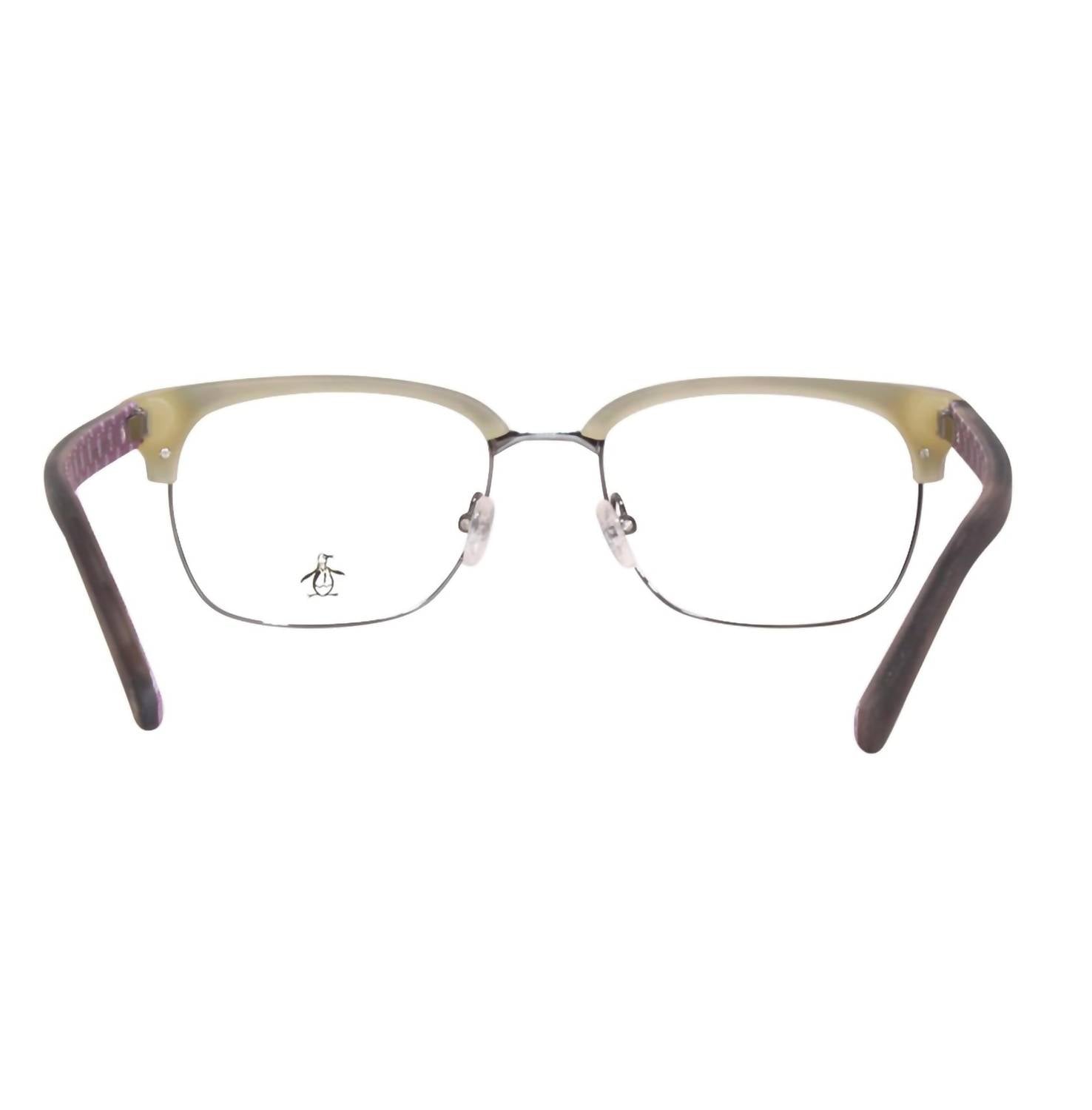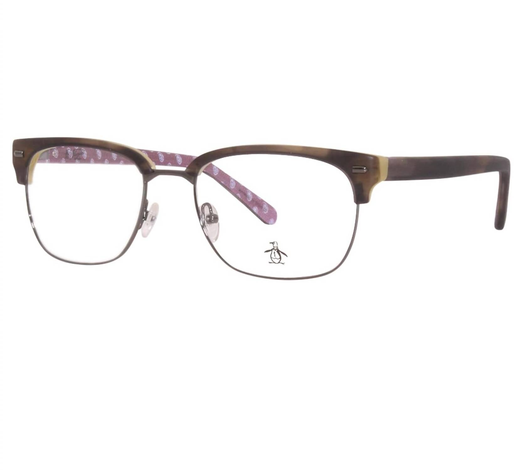 Discover the Men's The Sly Eyeglasses by Original Penguin, crafted with precision for both style and comfort. These full-frame, square-shaped glasses feature a lens width of 53mm, bridge size of 18mm, and temple length of 140mm. Made from durable metal in a sophisticated brown hue, they come with clear lenses and are available as progressive or bifocal. Perfect for those seeking versatile eyewear that doesn't compromise on quality.