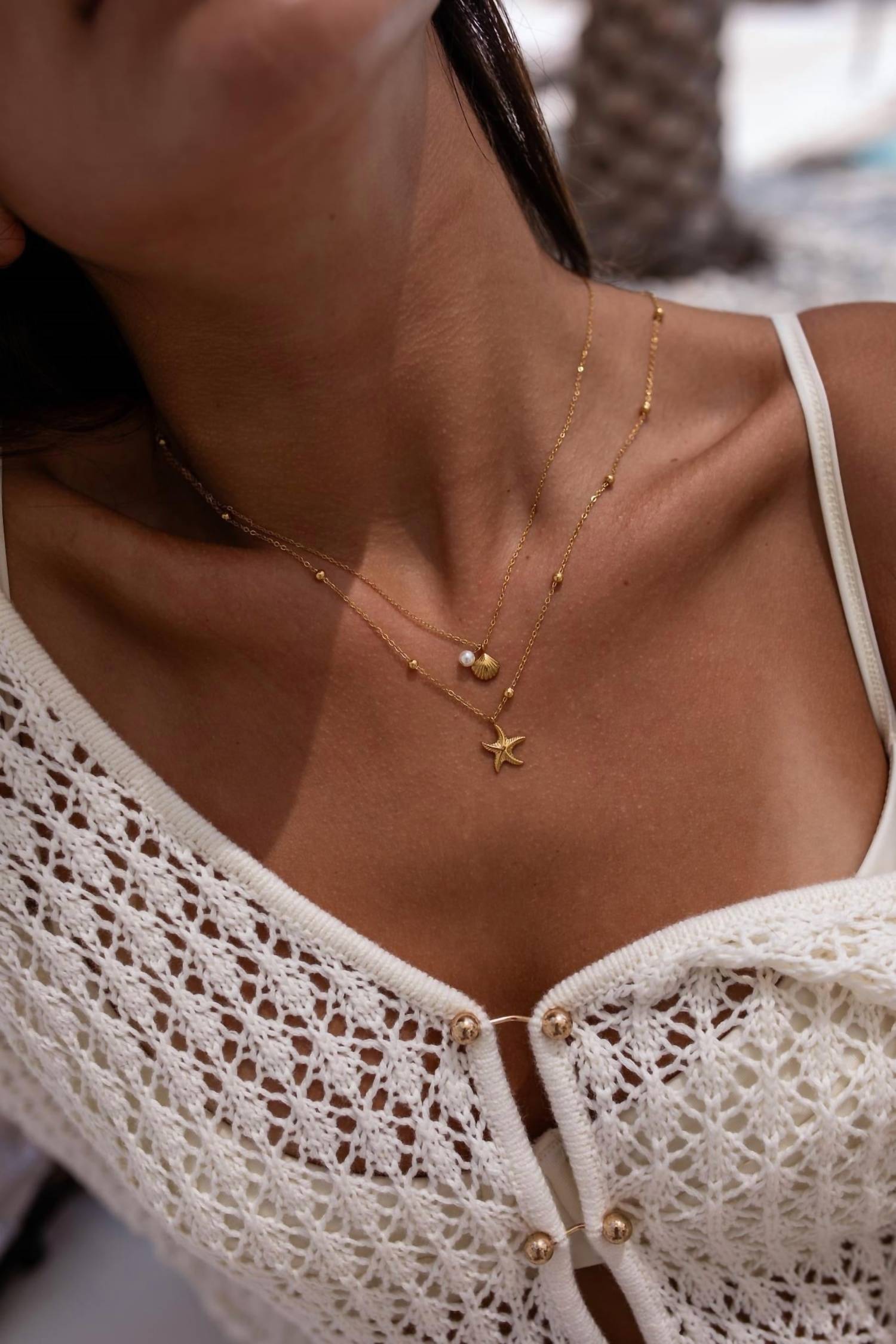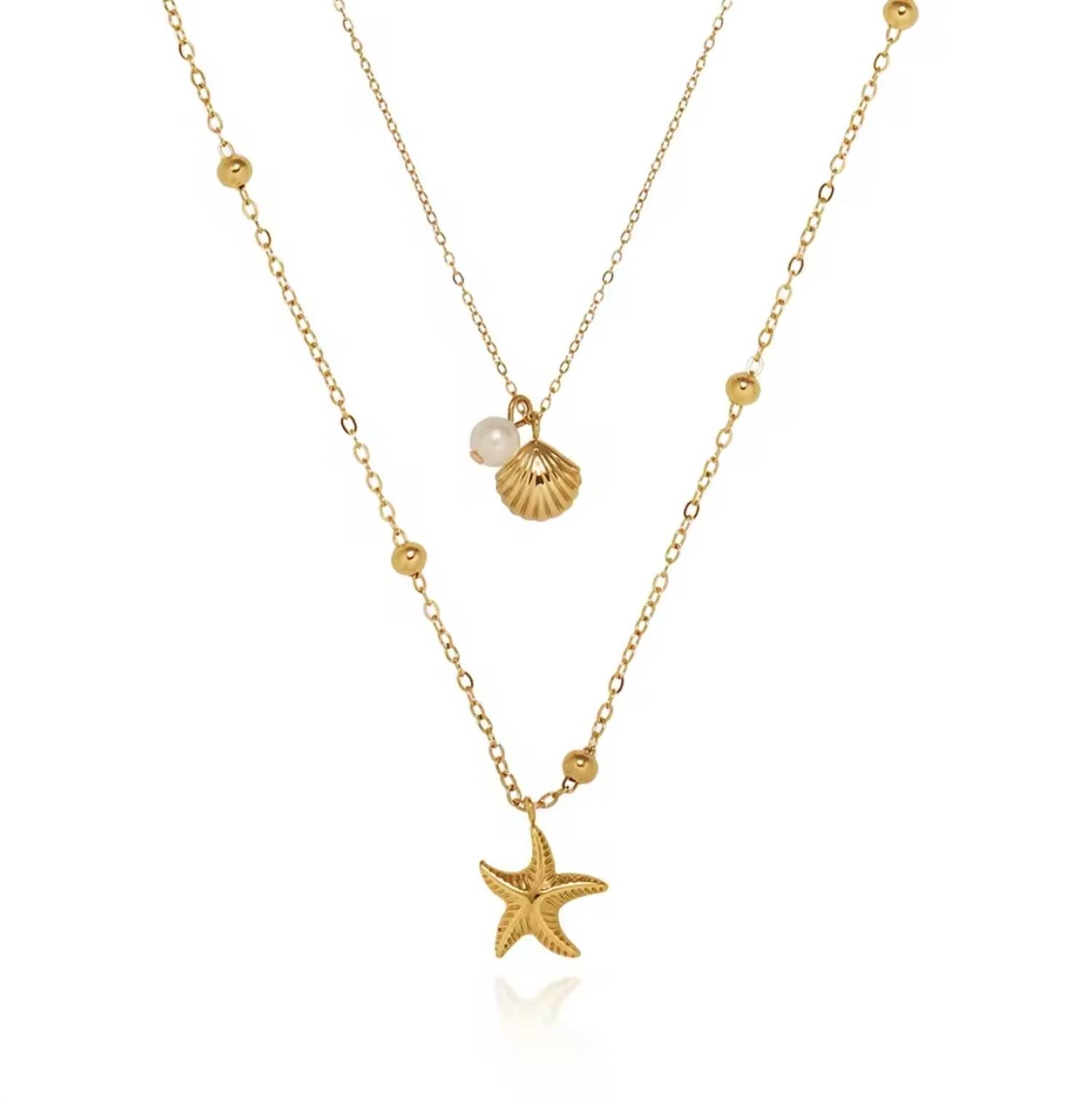 The perfect stand-out necklace that complements even the most basic t-shirt. Introducing the Women's Siren Necklace by Alchemy & Co, a perfect blend of elegance and coastal charm in stunning gold. This two-layer fashion necklace features a delicate starfish pendant on the longer chain, complemented by a beautiful shell and pearl duo on the shorter chain. Crafted from 18K gold-plated stainless steel, this jewelry piece is nickel-free, lead-free, hypoallergenic, tarnish, and water-resistant. Closure: Lobster clasp with a 2-inch chain extender for adjustable wear.