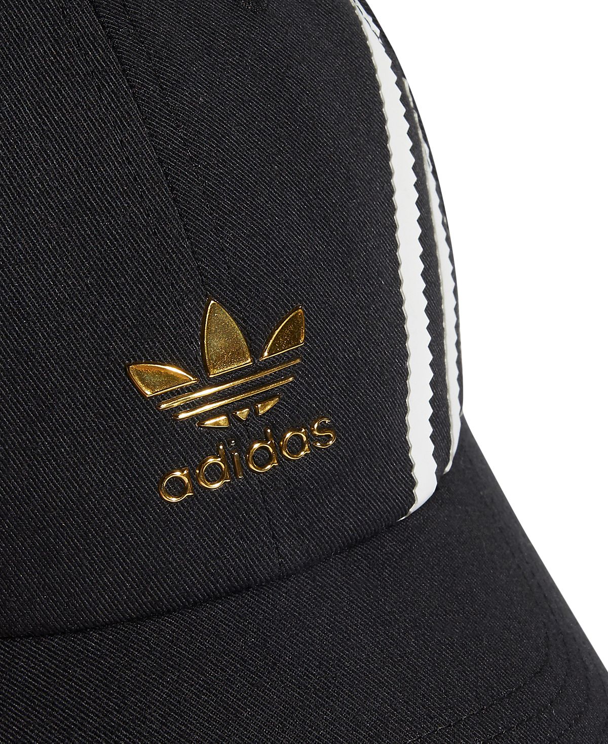 A metallic Trefoil logo brings the bling on this 6-panel adidas hat. It has a relaxed shape that's just right for everyday wear.| Relaxed fit| Six-panel design; medium pre-curve brim| Strapback clRegularure| Logo at center front; stripes at left front| Polyester (100% recycled)| Hand wash