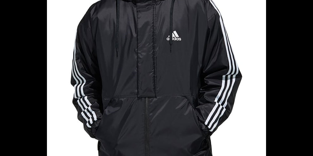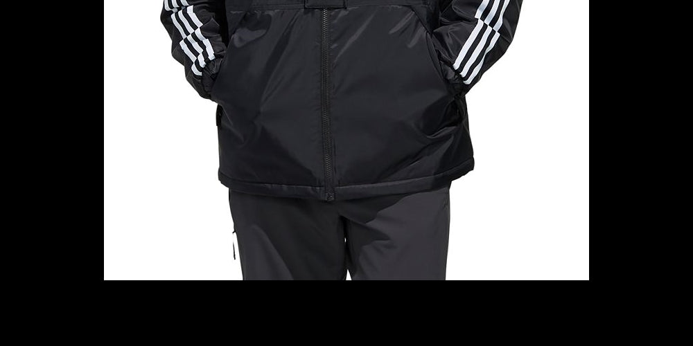Keep moving in the cold with this comfy jacket from adidas. The roomy fit features a water-repellent finish and cozy insulation.| Packable drawstring hood with stand collar; zipper closure at front| Woven fabric with PFC-free water-repellent finish; insulated; elastic cuffs| Lined pockets at front| Shell; recycled polyester; fill; polyester| Machine washable| Imported