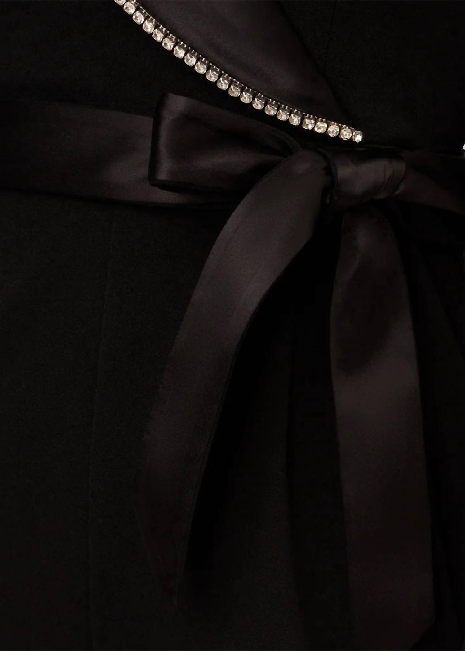 Introducing the Adrianna Papell Knit Crepe Jumpsuit, designed with a sophisticated surplice neck and relaxed straight-leg fit. This women's jumpsuit features elegant long sleeves and an embellished collar, adding a touch of luxury to your evening events. Composition: 95% Polyester, 5% Elastane. Closure: Zip closure. Care: Spot or wipe clean. Ideal for spring occasions, this solid black piece embodies quiet luxury.