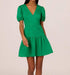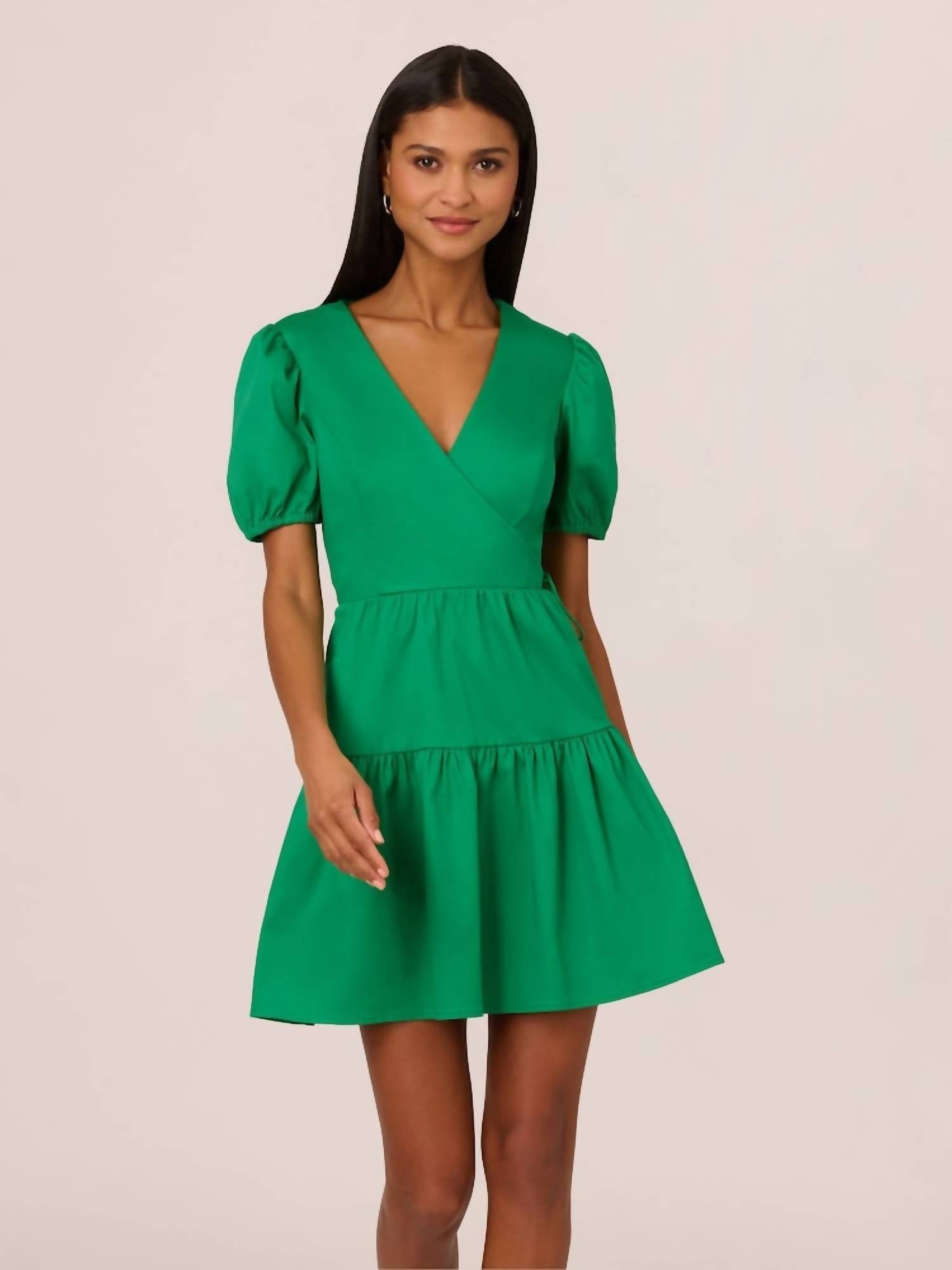 Perfect for sunny days or evenings out, this short-sleeved dress features a surplice V-neck bodice, puffed sleeves, and a tiered skirt enhanced with shirred detailing. Crafted from a soft stretch cotton blend, it includes a tie accent and an elastic waistband, making it an easy pull-on style that stays comfortable all day. Whether paired with casual mules or dressed up with metallic heels, this flirty tiered design offers versatile charm. Made from 98% cotton and 2% elastane.