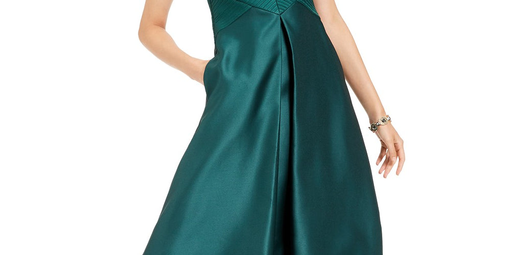 Approx. model height is 5'10" and she is wearing a size 4|Approx. 54-7/8" long from center back neck to hem. Length is based on size 4 and varies 1/4" between sizes|V-neck; Gown silhouette|Hidden back zipper with hook-and-eye closure|Mikado style; high-low hem; center front pleat; hip pockets|Polyester; lining: acetate