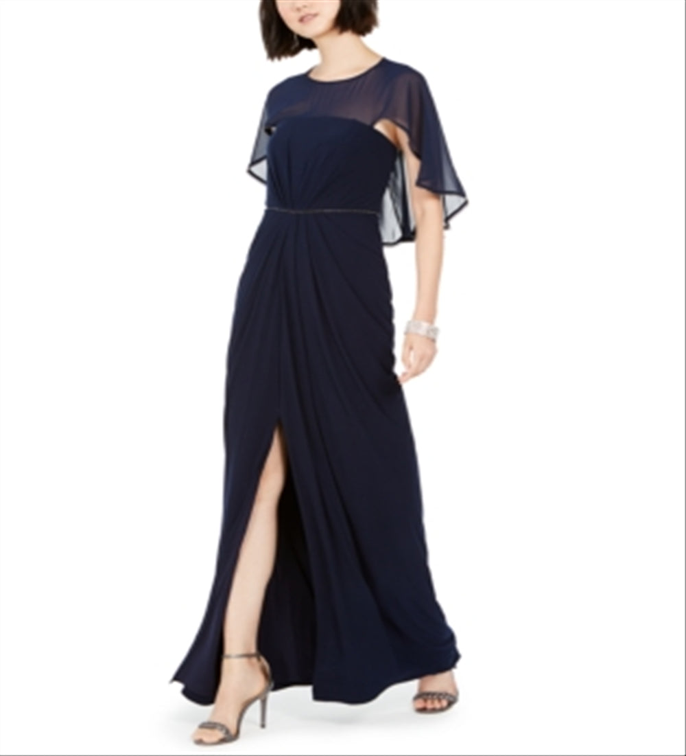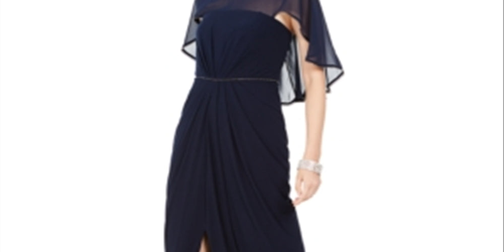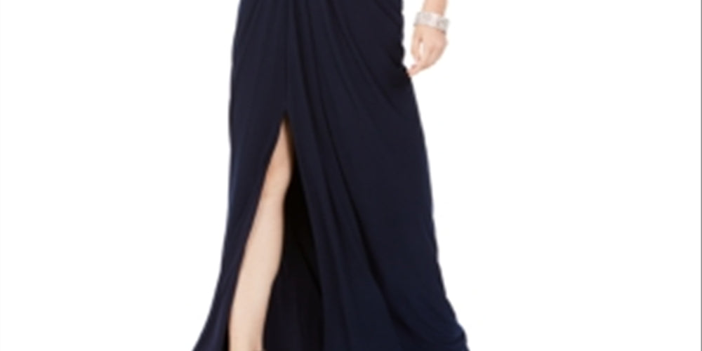 Adrianna Papell Women's Ruched Embellished Slitted Sleeveless Jewel Neck Full Length Fit Flare Evening Dress Blue Size 16