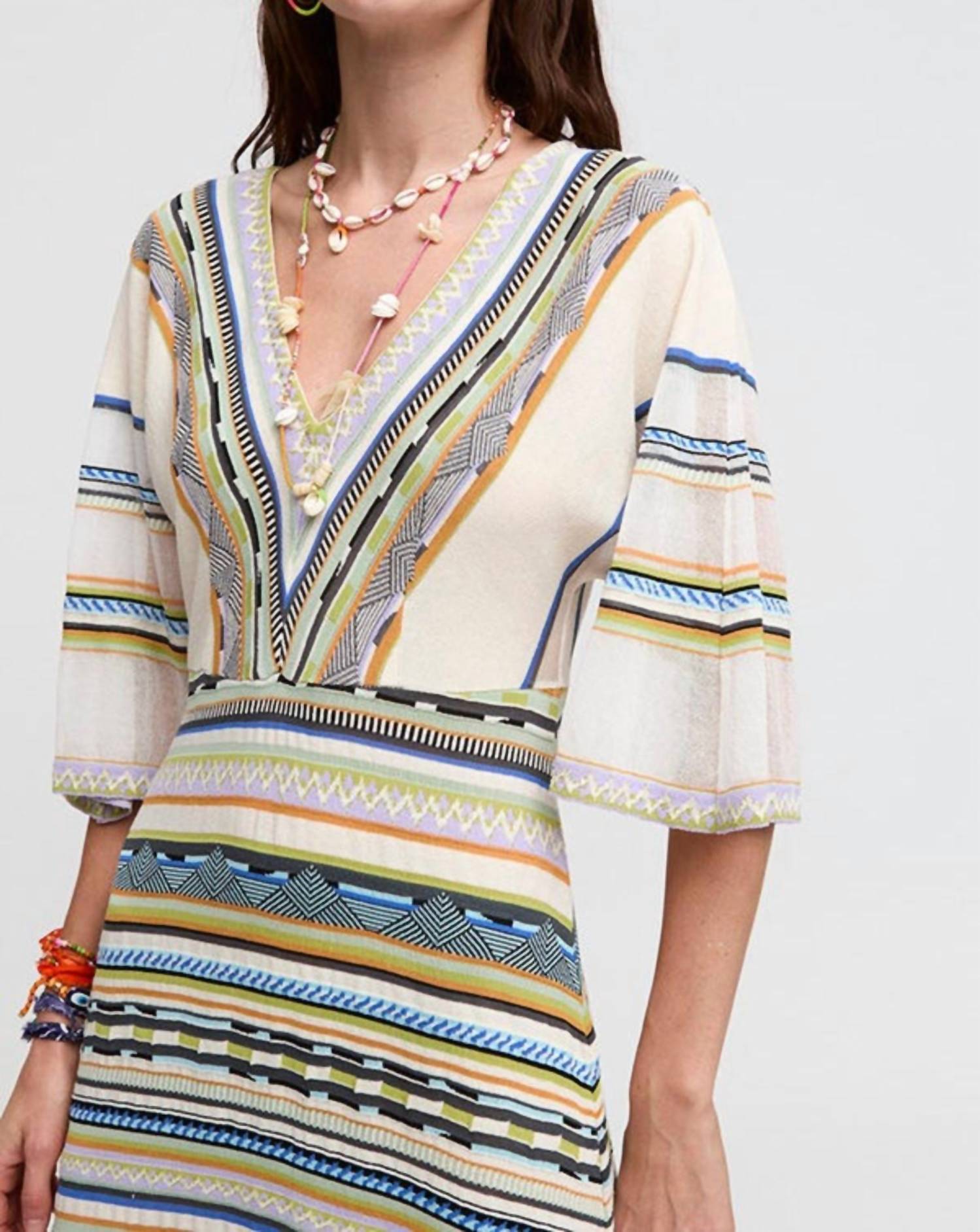A maxi dress that is just as cute as it is comfortable. Step into summer elegance with the Andros Dress by Aldo Martins, a perfect choice for vacation or Easter celebrations. This boho chic maxi dress features elbow-length sleeves and is crafted from a luxurious viscose blend (51% Viscose, 28% Polyamide, 14% Cotton, 7% Bamboo) with a stylish pattern that keeps you cool in the sunny season. The A-line silhouette and V-neck design lend a flattering fit that complements various occasions. Care is simple with machine wash instructions, making it easy to maintain its stylish allure.