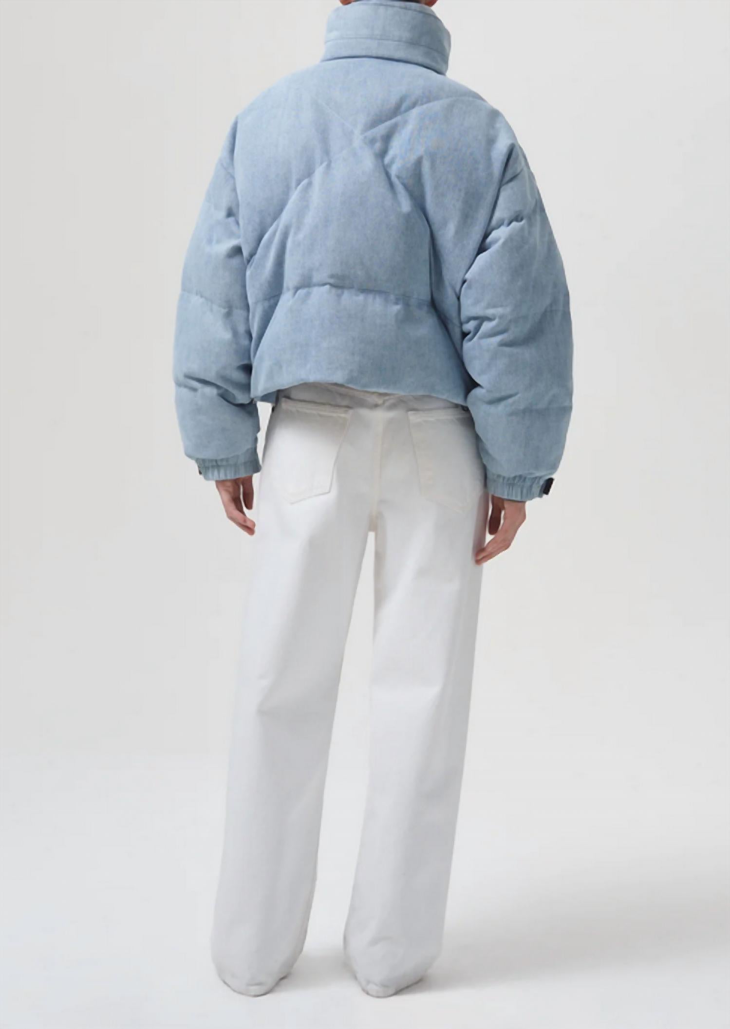 You'll be reaching for this puffer jacket all season long. Elevate your winter wardrobe with the Nova Denim Puffer Jacket by AGOLDE, a standout piece from their collaboration with Shoreditch Ski Club. This cropped, oversized jacket features long sleeves and is crafted from 100% organic cotton in a striking Marbled Indigo color. Designed to keep you warm and stylish, it includes a practical zip closure and convenient pockets for your essentials. Made in Vietnam, this collared jacket adheres to the minimalist trend and should be dry cleaned for best care.