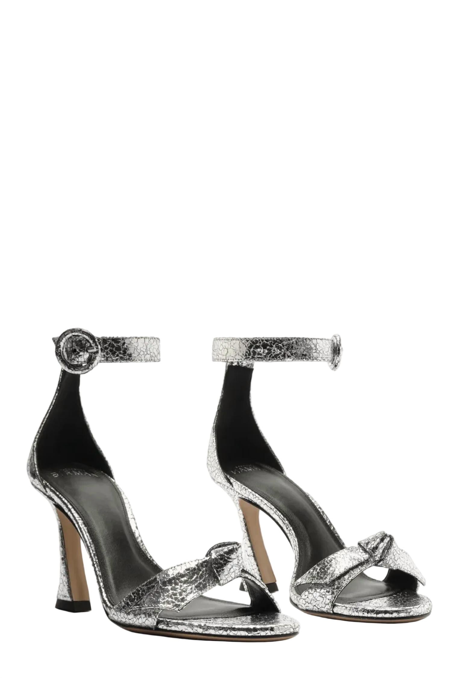 Flowy dresses, cropped pants, and even jumpsuits... this sandal works with them all! Step into sophistication with Alexandre Birman's Clarita Buckle 85 Sandals in a striking Argento hue. These sandals boast an open toe and an adjustable ankle strap buckle, perfectly combining comfort and style. Made from premium leather and leather sole, they feature a sculptural heel standing at a graceful 2.4 inches. Ideal for cocktail parties and other elegant gatherings, this minimalist design is a must-have for spring.