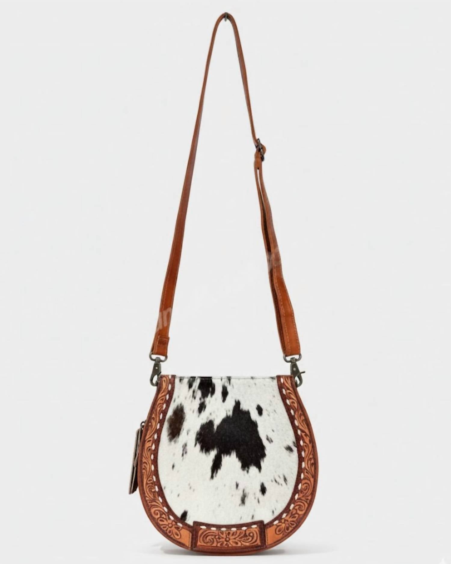 Introducing the Cowhide Horseshoe Purse by American Darling in an elegant white, black, and brown combination. Crafted from genuine and one-of-a-kind cowhide, this purse features a distinctive horseshoe shape with tooled leather and buckstitch trim. It offers functionality with a front magnetic snap closure, inside side zip and slip pockets, and a back zippered conceal carry pocket. With measurements of 10.5" H x 10" W x 3.75" D, it includes a removable smooth leather strap with an adjustable slide buckle.