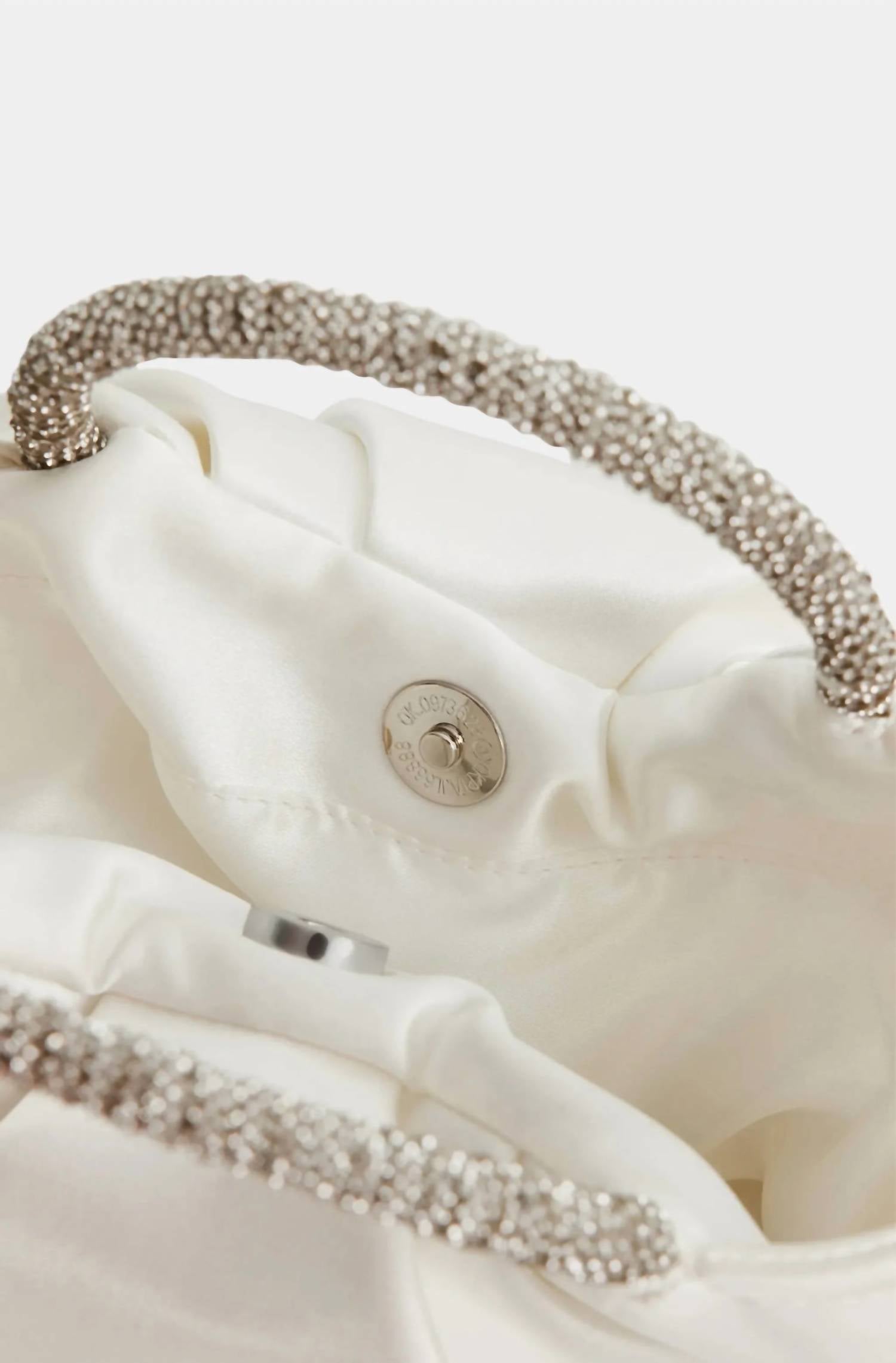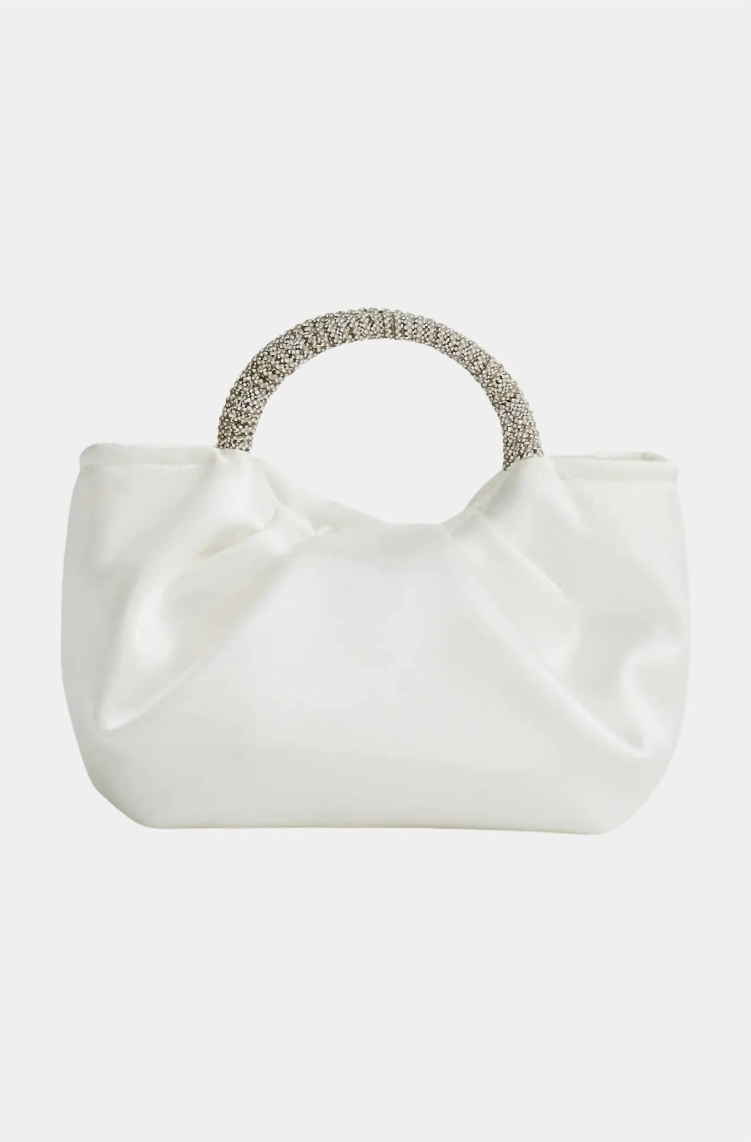 Introducing the Women's Aurelia Handle Bag by Billini, a sophisticated mini bag perfect for the modern bridal look. Designed with a soft, unstructured rectangular shape and an elegant fixed handle, it is beautifully embellished with shimmering silver diamante crystals. This chic white handbag is ideal for carrying essentials, effortlessly elevating any wedding ensemble. A must-have accessory for the contemporary bride.