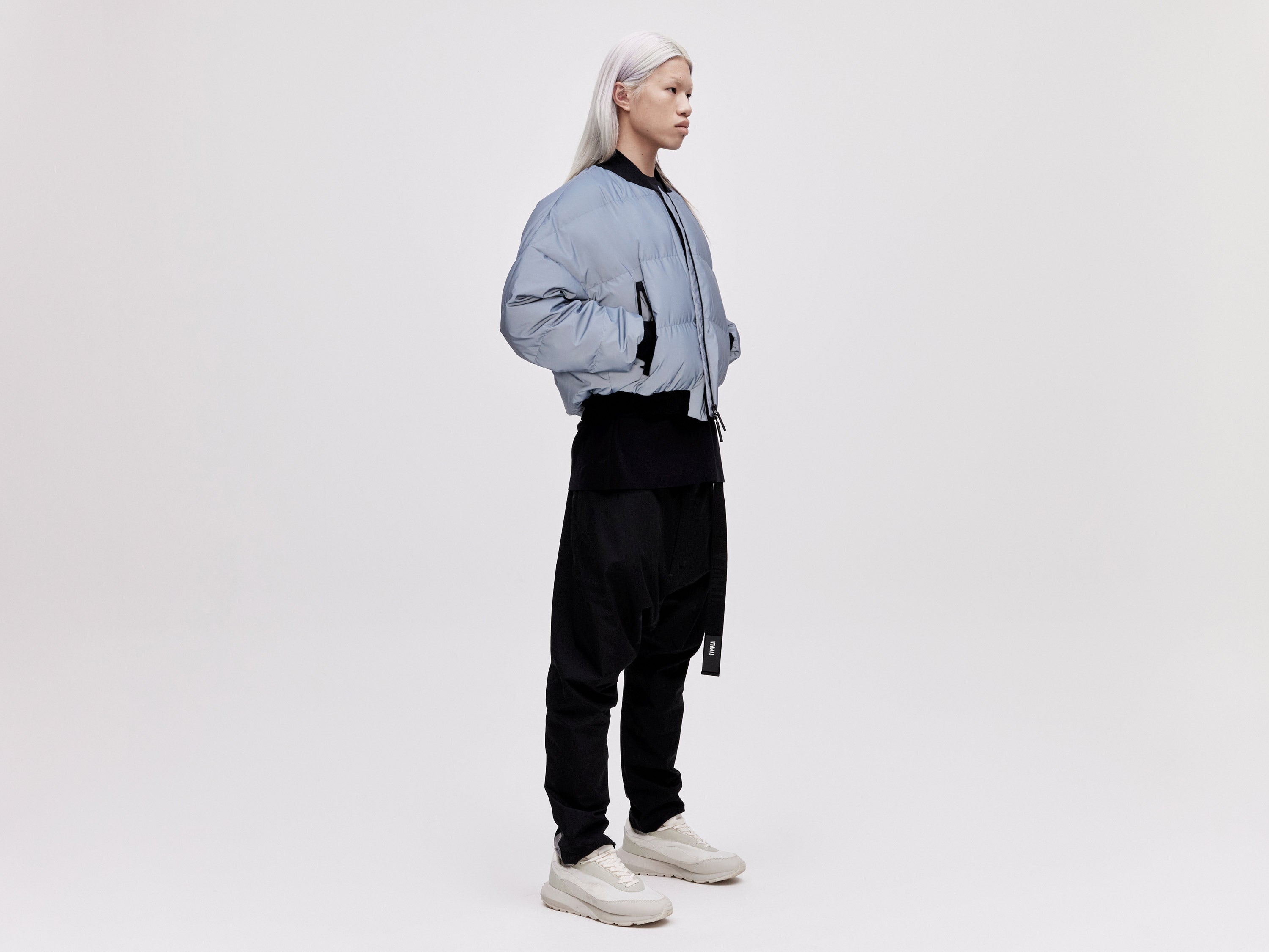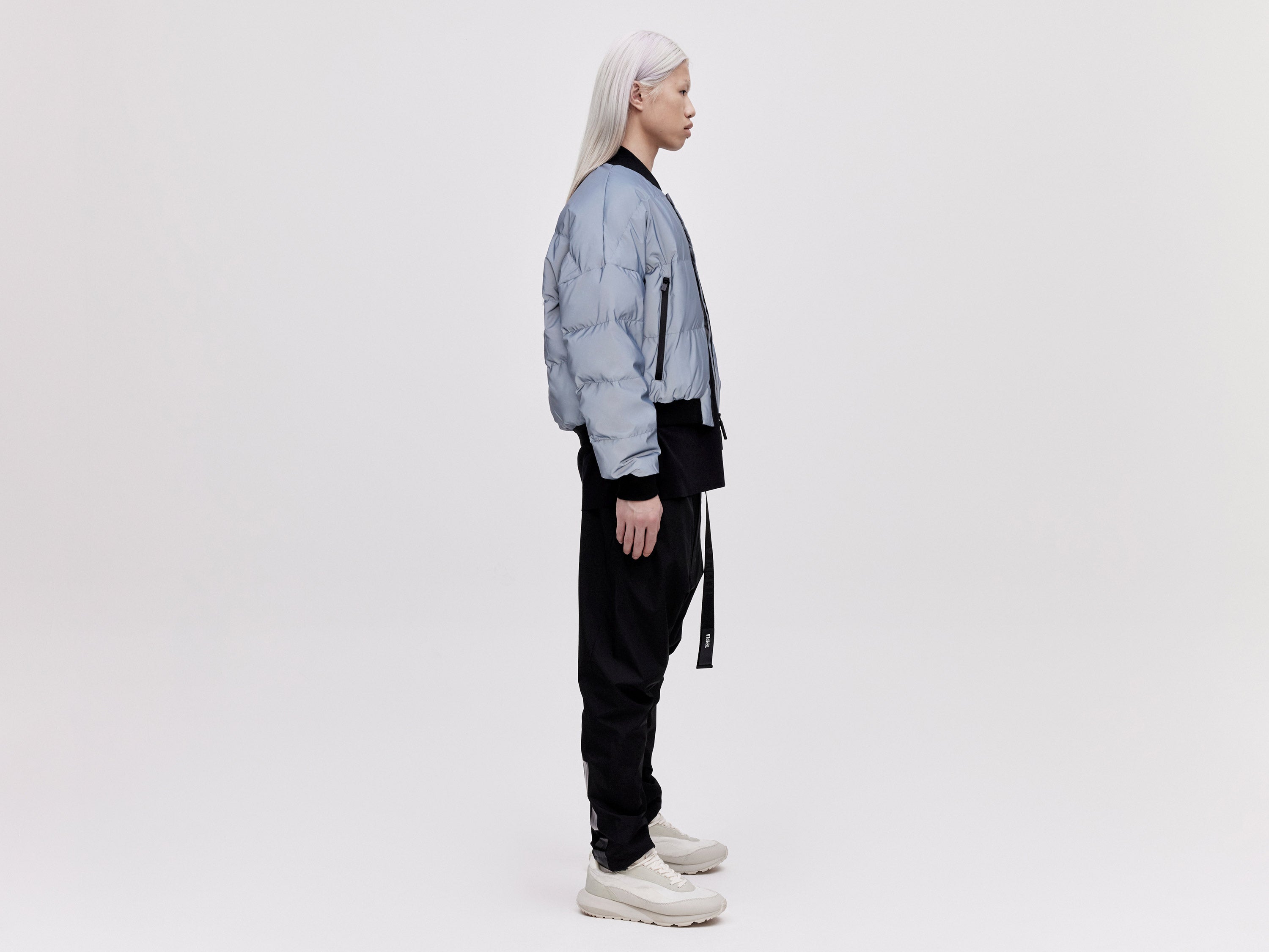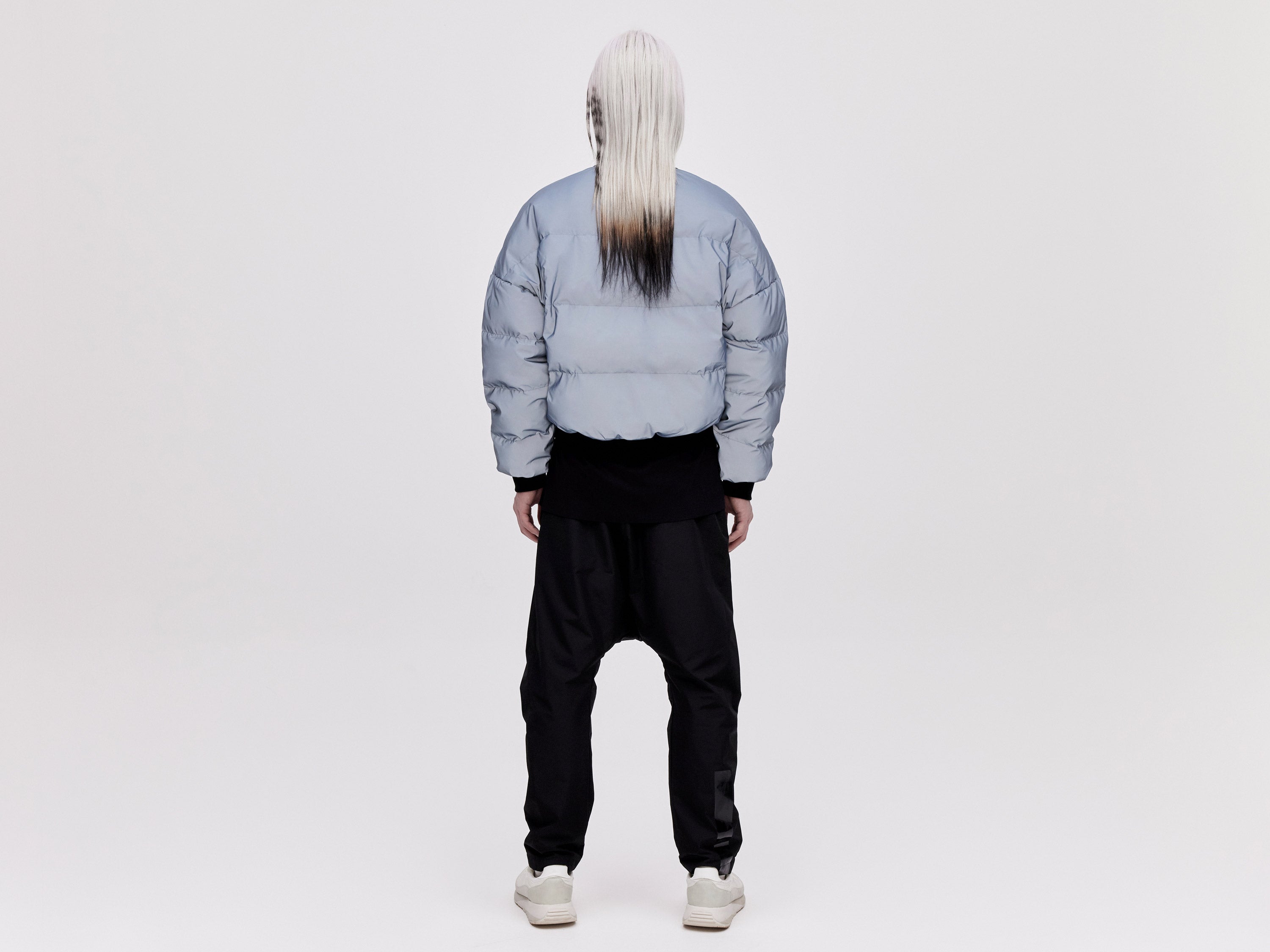 Our Reflective Bomber Down Jacket is designed with a contemporary oversized waisted fit and is finished with a ribbed collar and cuffs. It offers optimal insulation thanks to its premium white goose down padding and features a hyper-reflective shell fabric that is impregnated with thousands of micro-glass spheres for a unique appearance and hand feel.