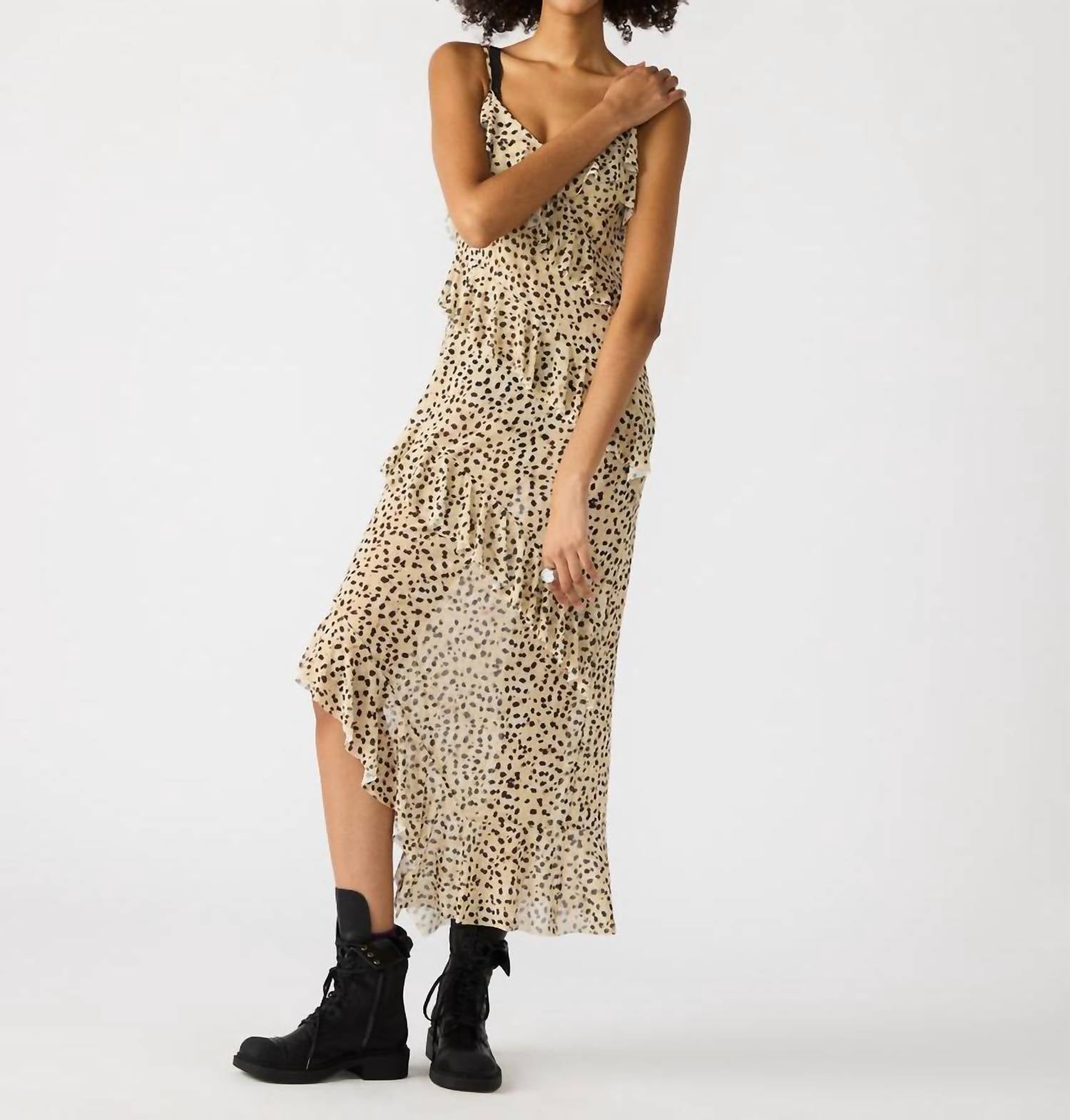 Embrace summer elegance with the Strap Tiered Ruffle Maxi Dress by Steve Madden, a stylish choice in a striking Desert Sand animal pattern. This women's sheath silhouette dress features delicate spaghetti straps and a chic tiered design perfect for a vacation or maximalist trend followers. Made from polyester, it offers a comfortable fit with a convenient tie closure for easy wear. Care for this beautiful piece by hand washing as recommended.