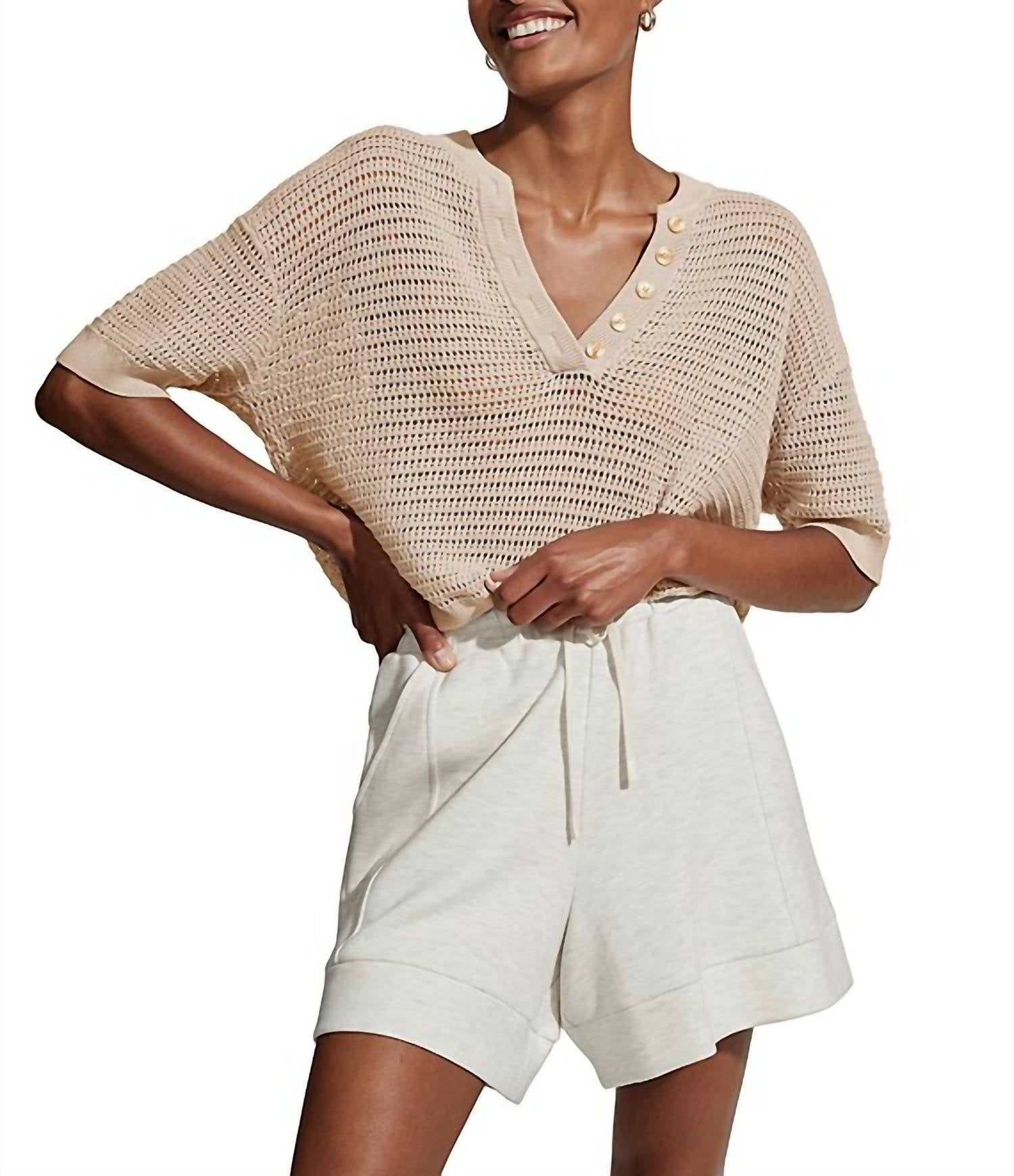 The Callie Knit Boxy Split Top by VARLEY, in an exquisite Moonlight hue, embodies minimalist elegance for any occasion. Designed with a textured pattern, it showcases elbow-length sleeves and a flattering V-neck, ideal for spring outings. This pull-on blouse is crafted from 100% Cotton, ensuring comfort and breathability. Care exclusively includes hand washing without bleach, ironing on a low setting, avoiding dry cleaning, and drying flat.