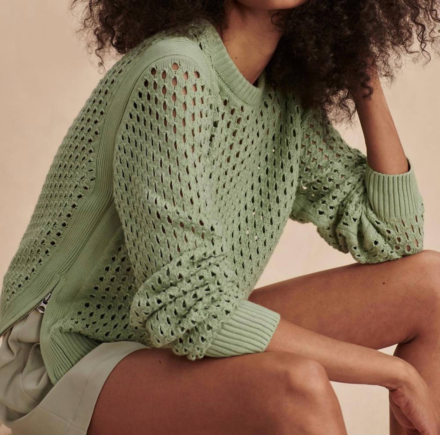 Introducing the Hains Knit Crew Sweater by VARLEY, a stylish and versatile piece in soothing Sage Green. This long sleeve sweater features a contemporary crewneck and practical side seam zips, perfect for layering. It's crafted from 100% cotton using a lightweight Pineapple Knit, offering a breathable textured finish ideal for spring travels. With a convenient pull-on closure, the sweater is easy to care for—simply machine wash and lay flat to dry.