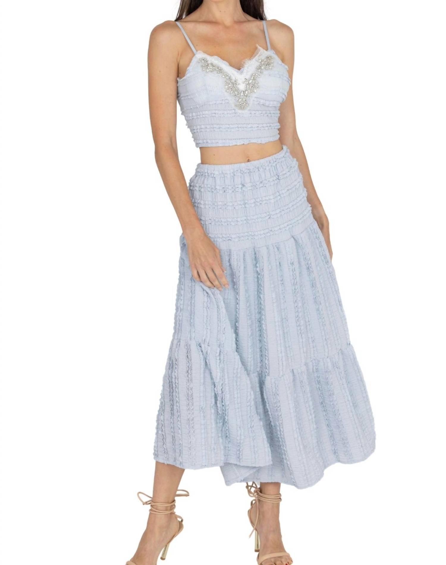 A set so cute you'll never want to take it off. Designed to look good while lounging, this little number is the perfect outfit for hanging at home in style. Introducing the Emma Crop Top & Maxi Skirt Set by Akalia, a romantic ensemble in a stunning blue hue perfect for vacation getaways and summer occasions. This sleeveless loungewear set features intricate lace embroidery, designed with a solid pattern that beautifully complements any sophisticated look. Composition: Cotton-polyester blend. Model is wearing a size XS.