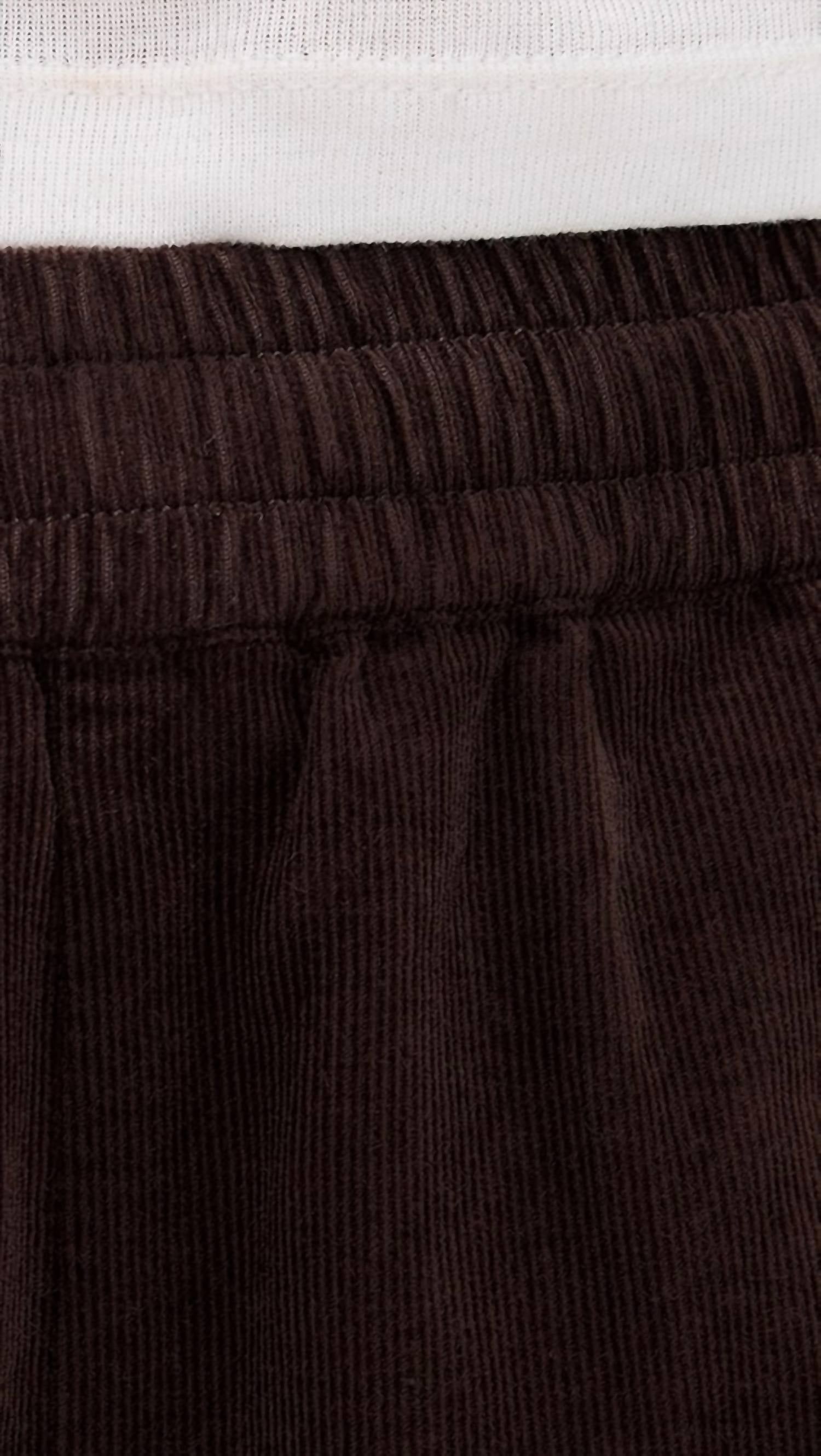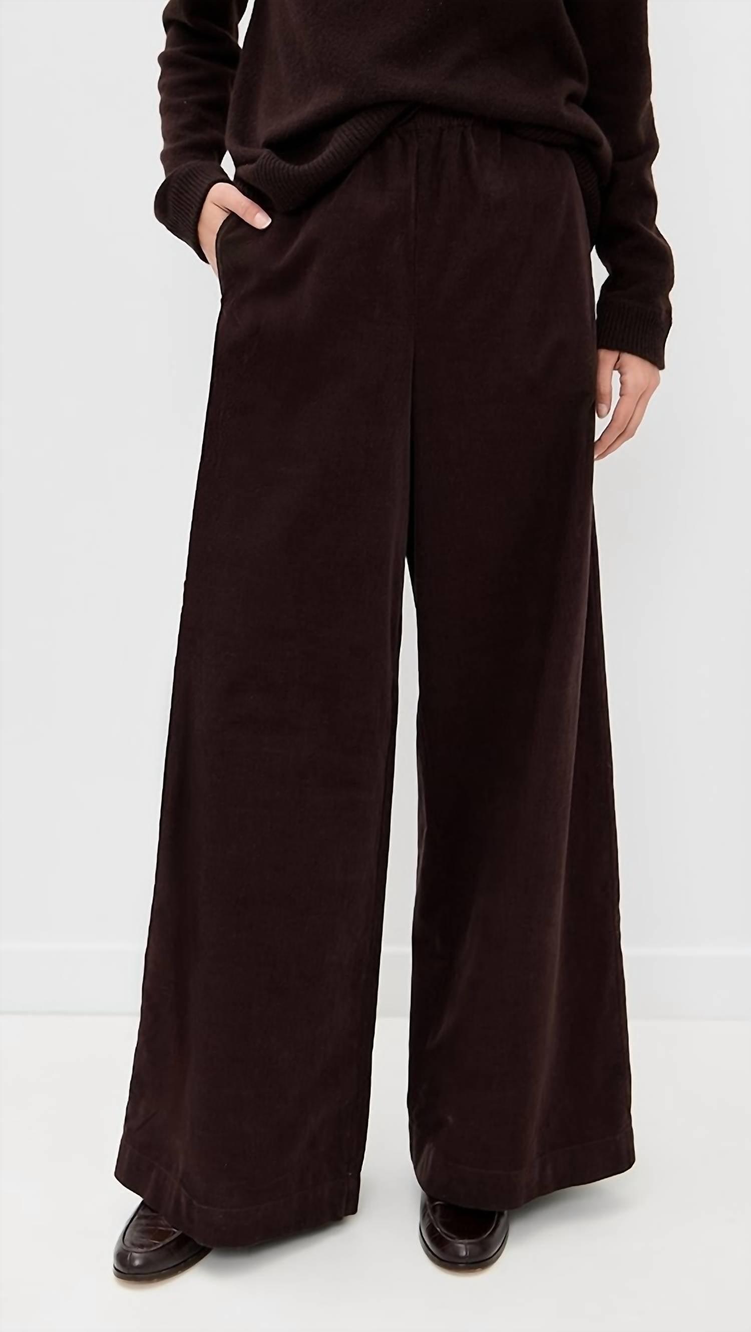 Discover the ATM Corduroy Wide Leg Pull On Pant, an essential for your fall wardrobe in rich chocolate. These pants feature a relaxed fit with a wide-leg style, crafted from mid-weight, low-stretch 100% cotton corduroy for a textured look. Designed with a covered elastic waist and interior drawstring, they offer both comfort and style. The pants include functional slant hip pockets and welt back pockets, ideal for travel or workwear. Care instructions state to wash cold and line dry for best results.
