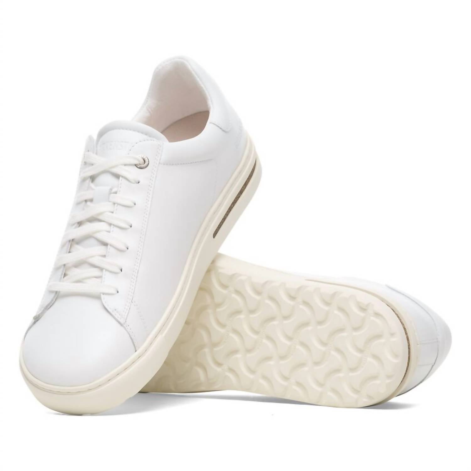 Embrace classic minimalism with the Birkenstock Women's Bend Low Leather Sneakers in White, a staple addition to any capsule wardrobe. Crafted with natural leather and a breathable microfiber lining, these sneakers offer comfort without sacrificing style. The removable, anatomically shaped cork-latex footbed, coupled with an extra cork insole, ensures optimal shock absorption for all-day wear. Made in Portugal, these flat sneakers feature a round toe and are perfect for spring travel or casual Fourth of July outings.