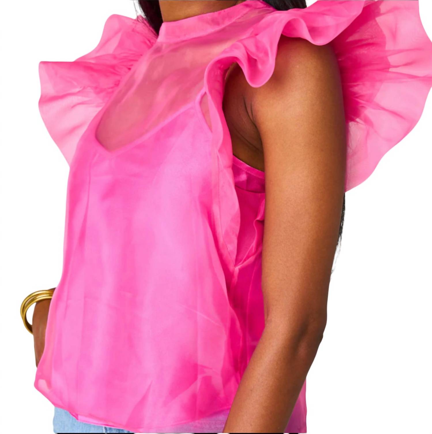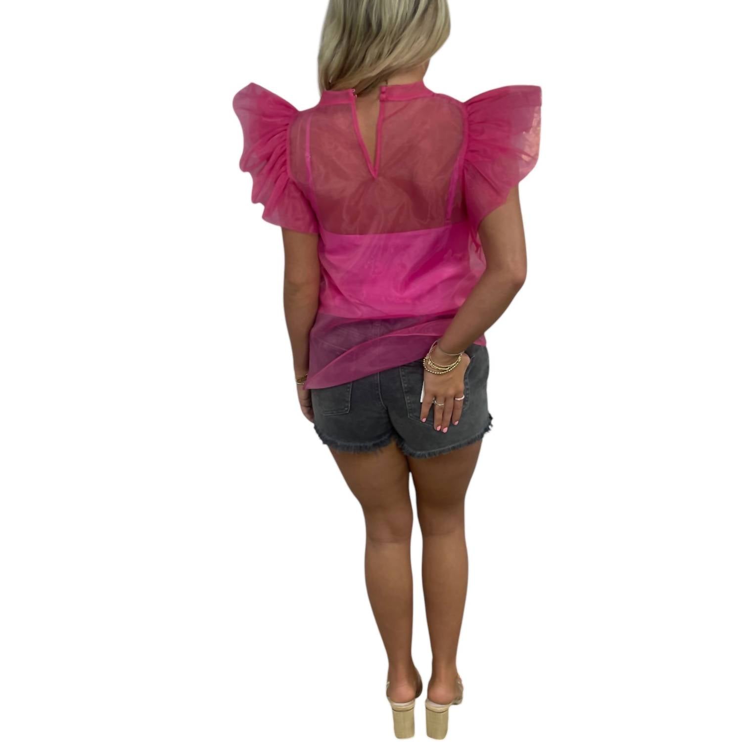 A versatile blouse that works from desk to dinner!Femme, sweet and fun in this statement top! The Kaycee Top features an organza shell with a satin tank underneath, 2 button keyhole closure, and a bold ruffled sleeve. Fabric contains no stretch. Material: 100% Polyester.