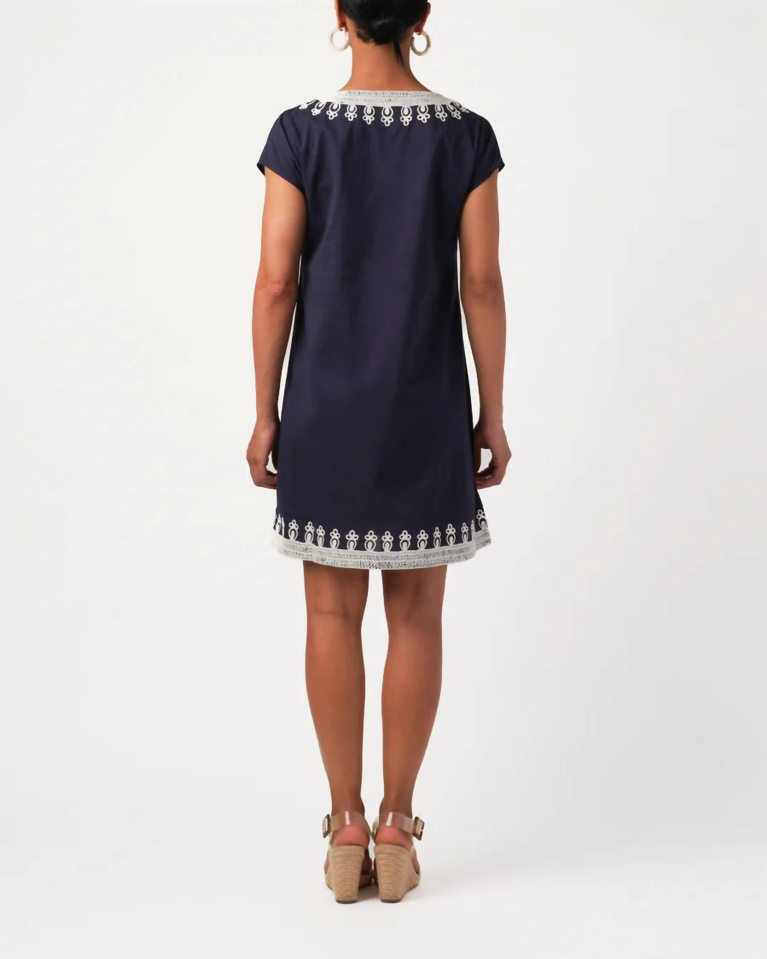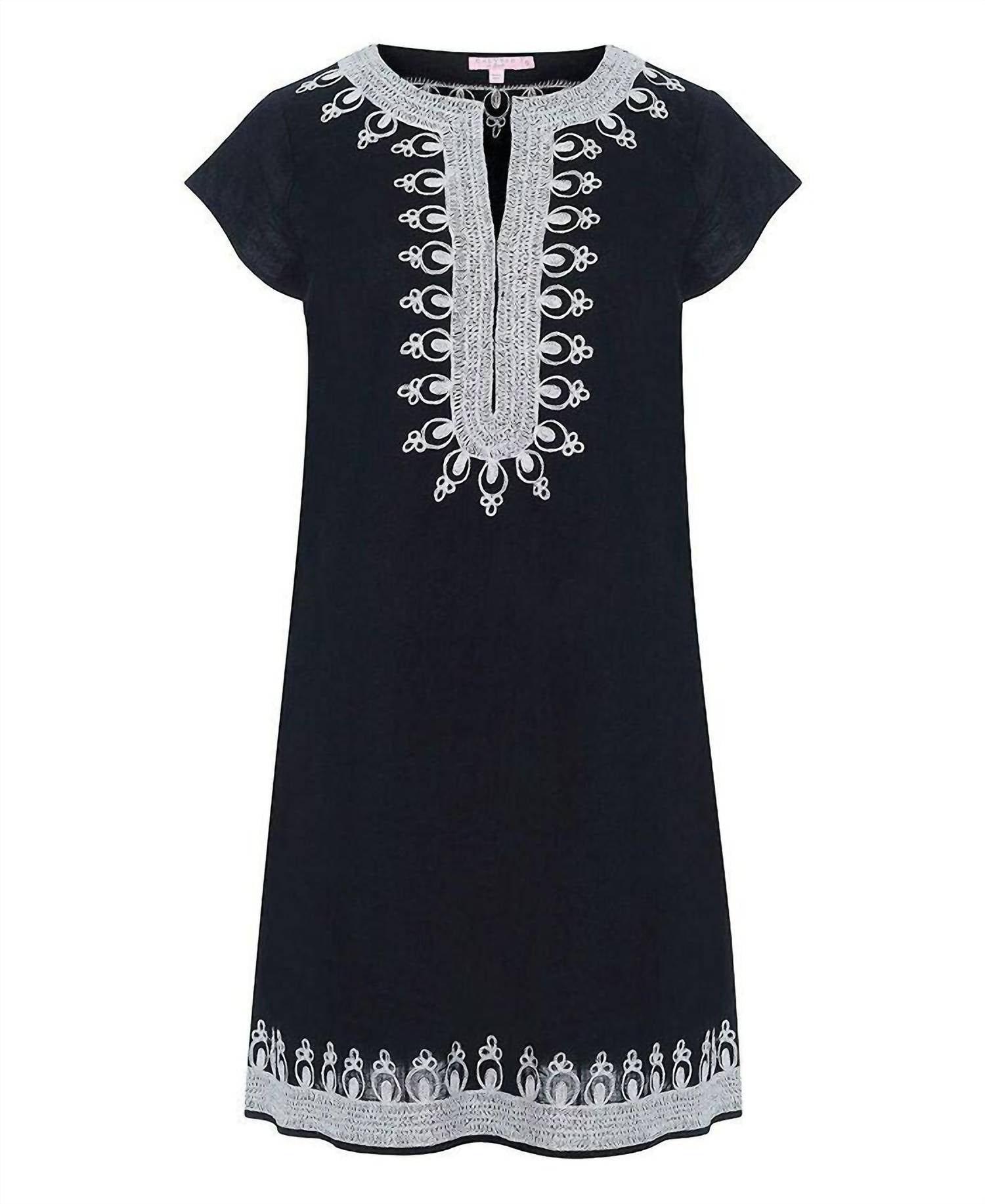 Discover the Rowena Tunic Dress by Calypso St. Barth, a beloved summer piece perfect for vacations with its sleeveless design. Made from 100% cotton and featuring intricate embroidery on the V-neckline, this effortless indigo and white dress offers both comfort and style. Crafted in India, it features a convenient pull-on closure. For best care, dry clean only to maintain its quality.
