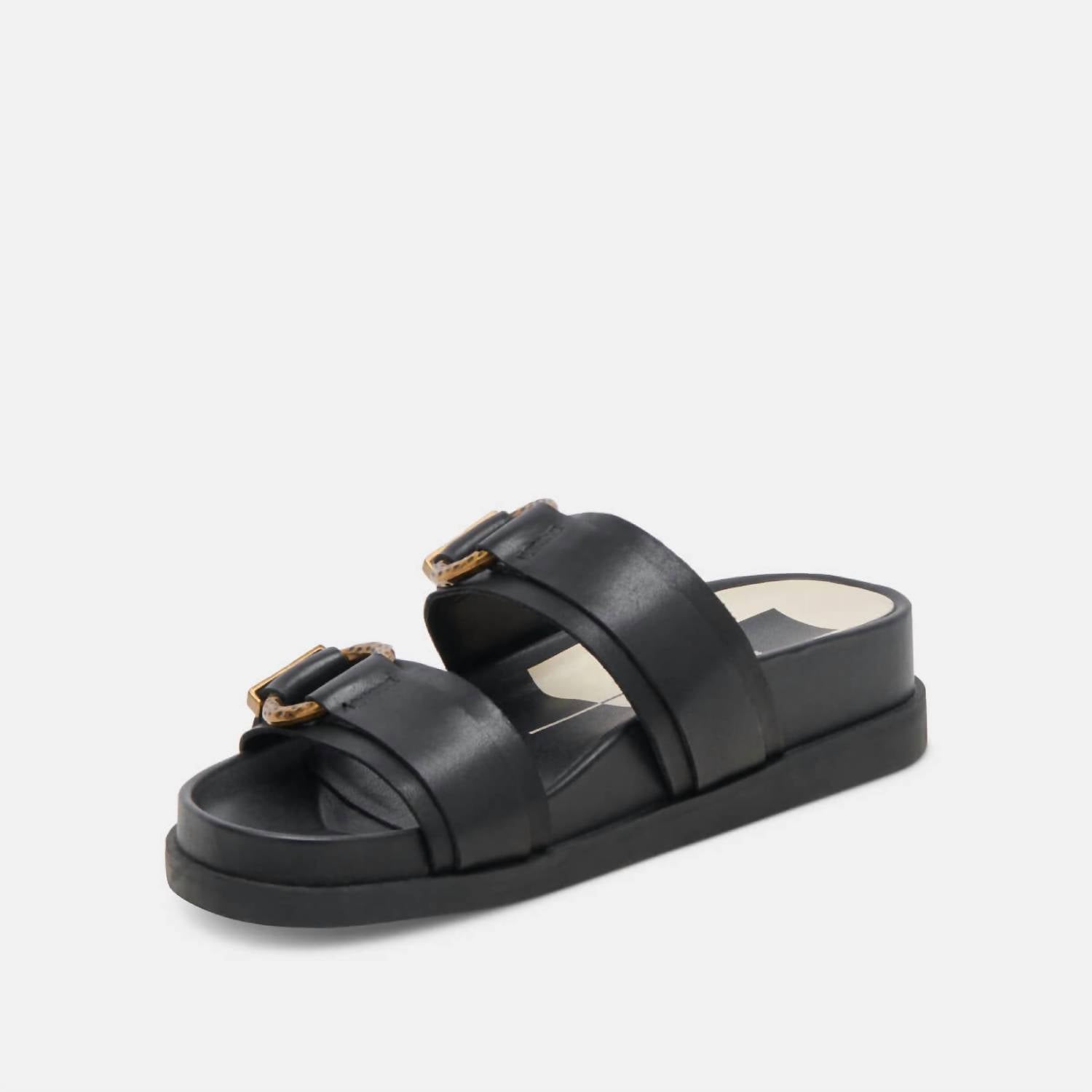 Classicly cute and all-day-wearable. We love this sandal.Minimal slide silhouette. Oversized buckle with gold accents. Black noir embossed leather. Leather upper with water-based leather. Recycled synthetic outsole. Open-toe design. Flat sole for all-day comfort.