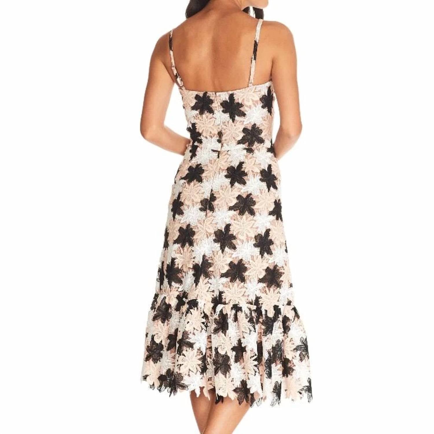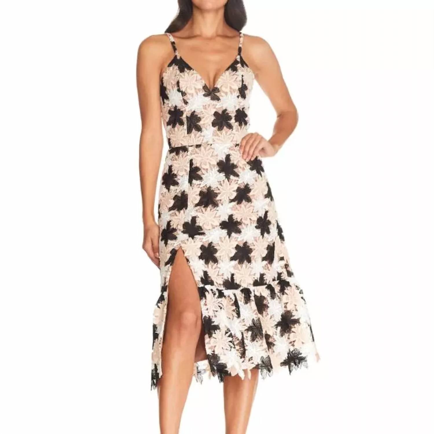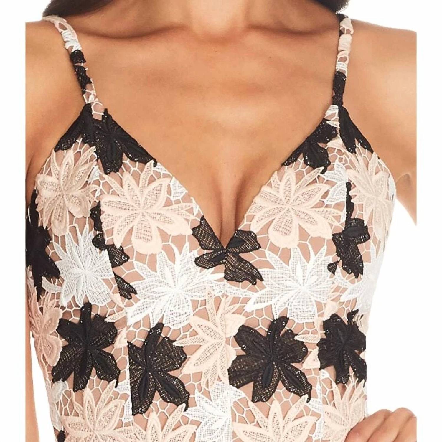Just add slides or mules and you are good to go. Step into elegance with the Chantal Floral Lace Dress by Dress The Population, crafted to enhance your confident style. This dress features delicate spaghetti straps and a flattering sweetheart bodice adorned with a V-neckline, complemented by a ruffle-hem and a practical slit for ease of movement. With a length of 38 inches, it is made entirely of polyester for a graceful fit, offering a hidden back-zip closure for a seamless finish. Care for this dress with a gentle hand wash to preserve its intricate lace details. 100% polyester.