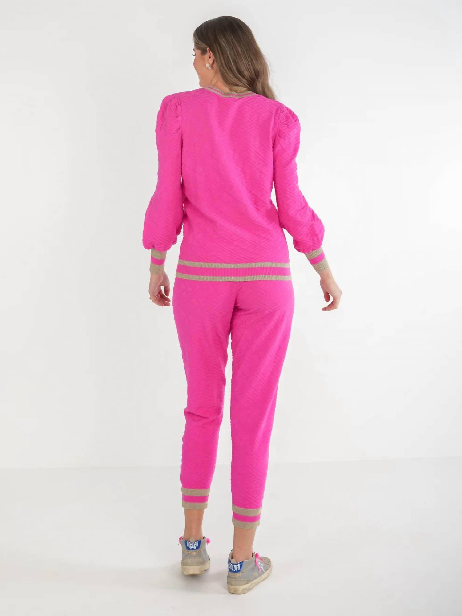 Stay warm and stylish in this versatile and effortlessly cool knitwear staple. Wear it alone or layered, it's the perfect sweater for the season and you'll wish you had it in every color. Discover the Julia Sweater by Emily McCarthy, the perfect addition to your holiday wardrobe. This long sleeve sweater in Rose Monogram Knit features a crewneck adorned with gold and pink stripe accents, adding a touch of elegance to its textured design. Made from a viscose blend, it offers a minimalist style suitable for Thanksgiving and other holiday parties. Closure: Pull on. Care instructions include hand wash and line dry to maintain its luxurious feel.