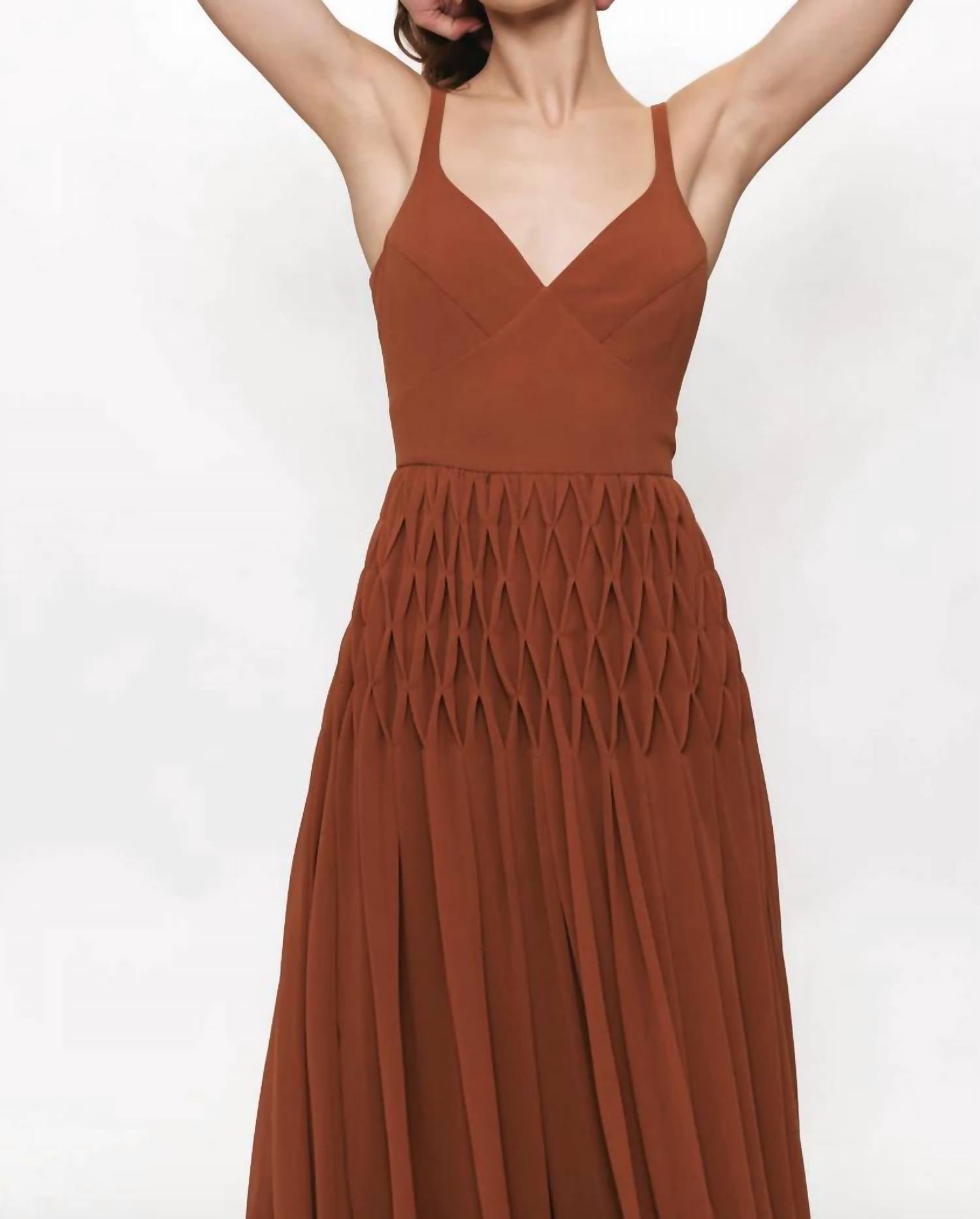 Style this maxi with your favorite statement necklace and sandals for the perfect look. Introducing the elegant Hutch Chapman Dress in a rich caramel hue, crafted from luxurious chiffon for a sophisticated fit and flare silhouette. This sleeveless maxi dress features a fitted bodice and a V-neckline, measuring 58 inches from the high point shoulder for an elegant drape. It is composed of polyester with a convenient center back zip closure, providing ease of wear. To maintain its stunning form, please dry clean only.