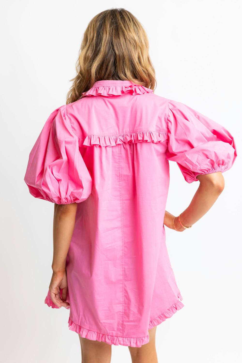 The kind of easy and flattering dress you'll be reaching for all season long. Step into summer style with the Women's Puff Ruffle Dress by Karlie, a minimalist masterpiece perfect for vacation getaways. This A-line mini dress in a solid pink hue features a chic collar and short sleeves that lend an effortless elegance to your look. Crafted with a button closure, it embodies both comfort and fashion-forward design. The absence of pockets ensures a sleek silhouette, making it a versatile addition to your warm-weather wardrobe.