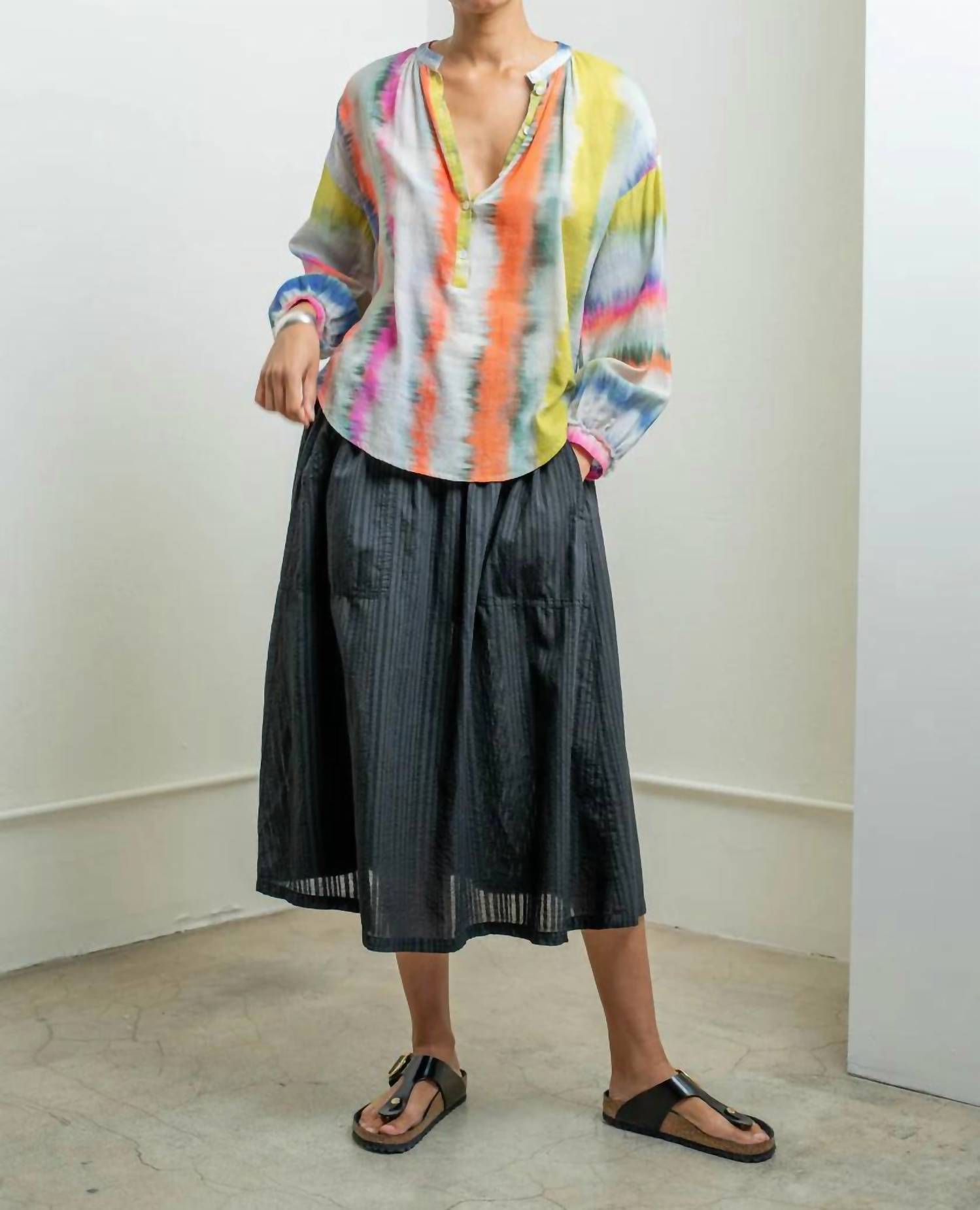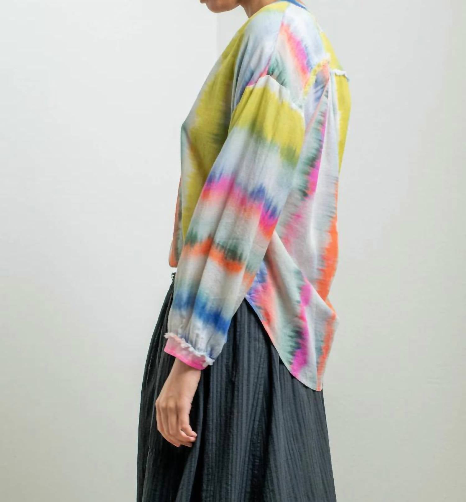 A timeless blouse that will never go out of style. Introducing the Dee Blouse by Raquel Allegra, designed for women who appreciate a touch of vintage romance. This long sleeve blouse is crafted from 100% cotton in a lightweight basketweave, showcasing a bold Ikat Stripe pattern that enhances its maximalist appeal. With a V-neckline and a pull-on closure, its silhouette adds subtle structure with soft shirring and frayed cuffs for added texture. Perfect for summer vacations, this eye-catching piece is inspired by the handcrafted quality of traditional ikat weaving and brings a splash of psychedelic color to any wardrobe.