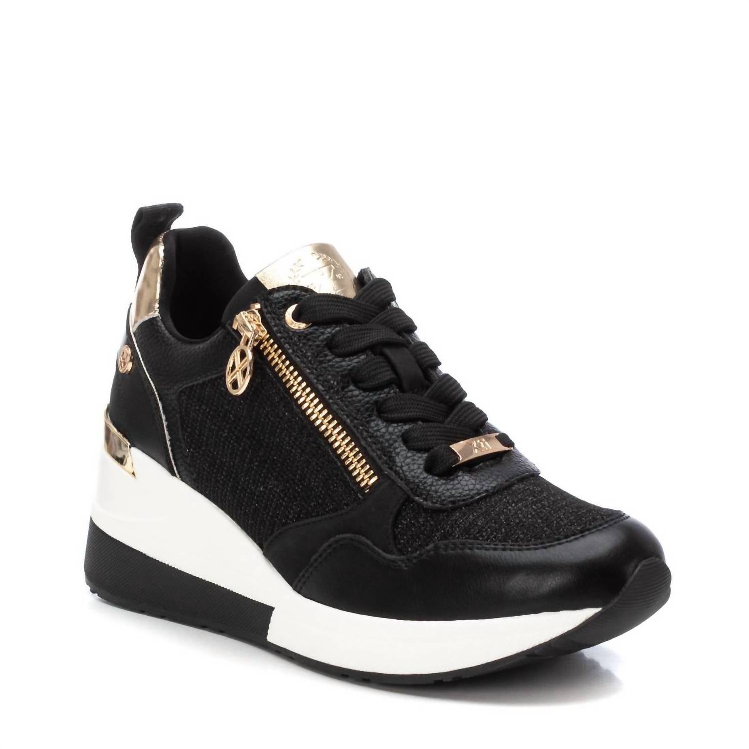 When fashion and function come together seamlessly. Stride in style with the Xti Women's Wedge Fashion Sneakers, blending fashion with comfort. Crafted from faux leather and metallic textile material, these sneakers feature a convenient zip fastening. Designed with a 1.75-inch wedge heel and an anti-slip rubber sole, they offer both height and stability. Certified vegan by PETA, they also come with a Comfortech insole for all-day wearability.