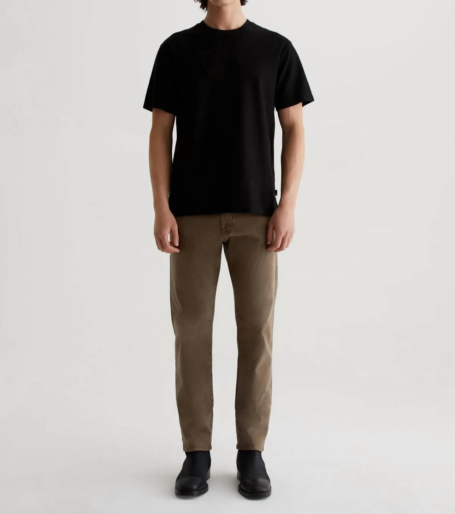 The Tellis Sueded Sateen Slim Fit Pants by AG Jeans are crafted for the modern minimalist in a sleek Sulfur Faded Ashwood hue. These men's pants feature a slim fit and straight leg style, made from soft and lightweight sueded stretch sateen fabric sourced from Italy. Designed with practicality in mind, they include pockets and a zip closure. Easy to care for, they are machine washable and can be tumble dried, making them an ideal choice for spring travel.