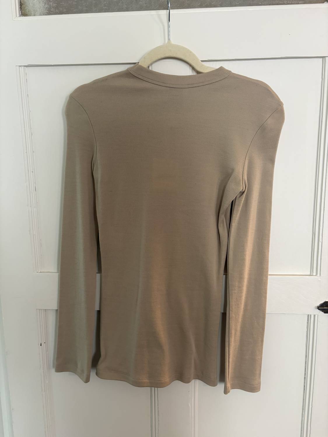 Experience the elegance of simplicity with the Women's Maglia Wool Jersey Long Sleeve Top by ALYSI, perfect for a minimalist spring wardrobe. Made in a luxurious sand-colored solid wool jersey, this top features long sleeves and a classic crewneck design. Closure: Pull on for effortless dressing. Care: Dry clean only.