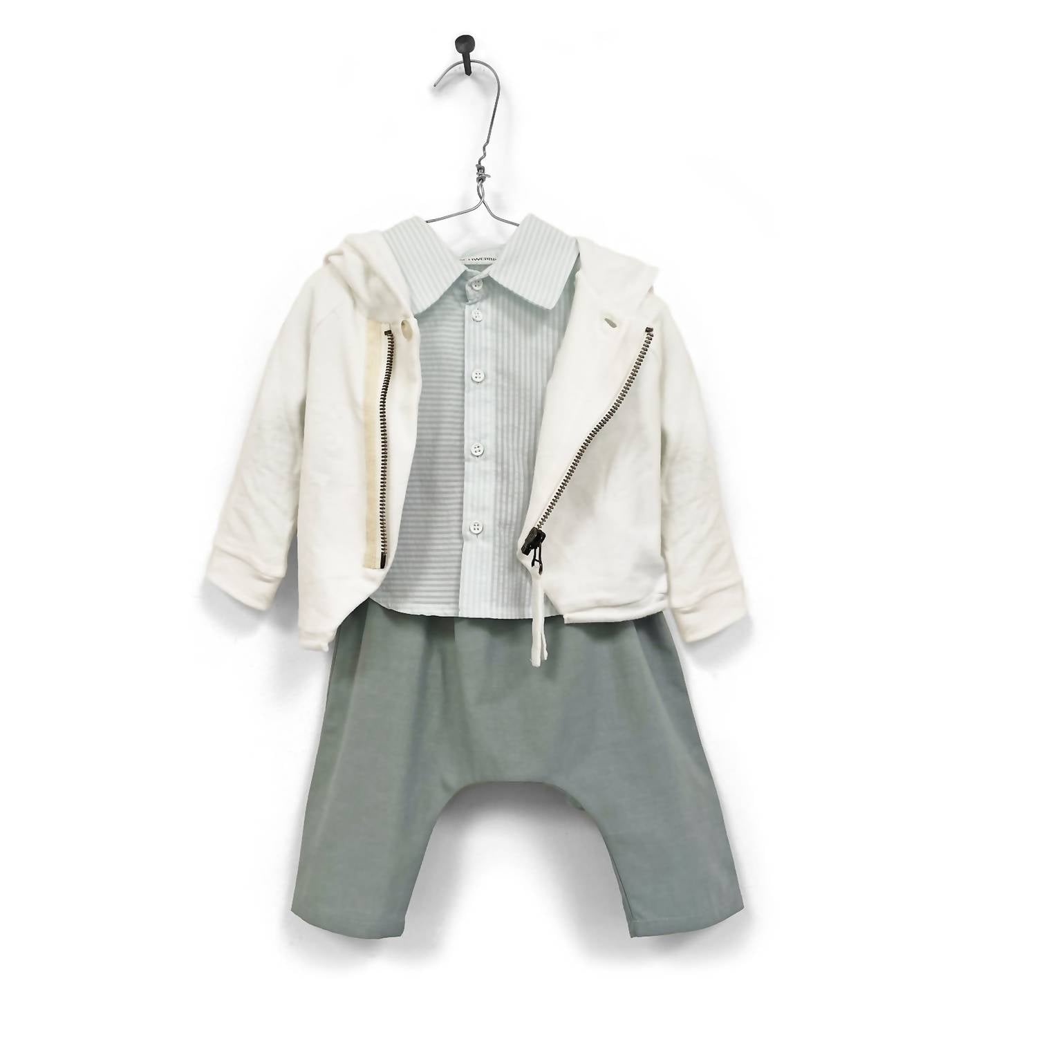 Introducing the Kid's Lavoni Soft Organic Cardigan by Anja Schwerbrock, a minimalist piece perfect for a Thanksgiving gathering. This unisex hoodie is crafted from a soft cotton elastane blend, delivering supreme comfort with its super soft brushed fabric. It features an asymmetric front line with contrasting grosgrain detailing and a zipper closure, available in classic white. Ideal for the fall season's holiday parties, this piece is part of the brand's permanent collection, ensuring timeless style.