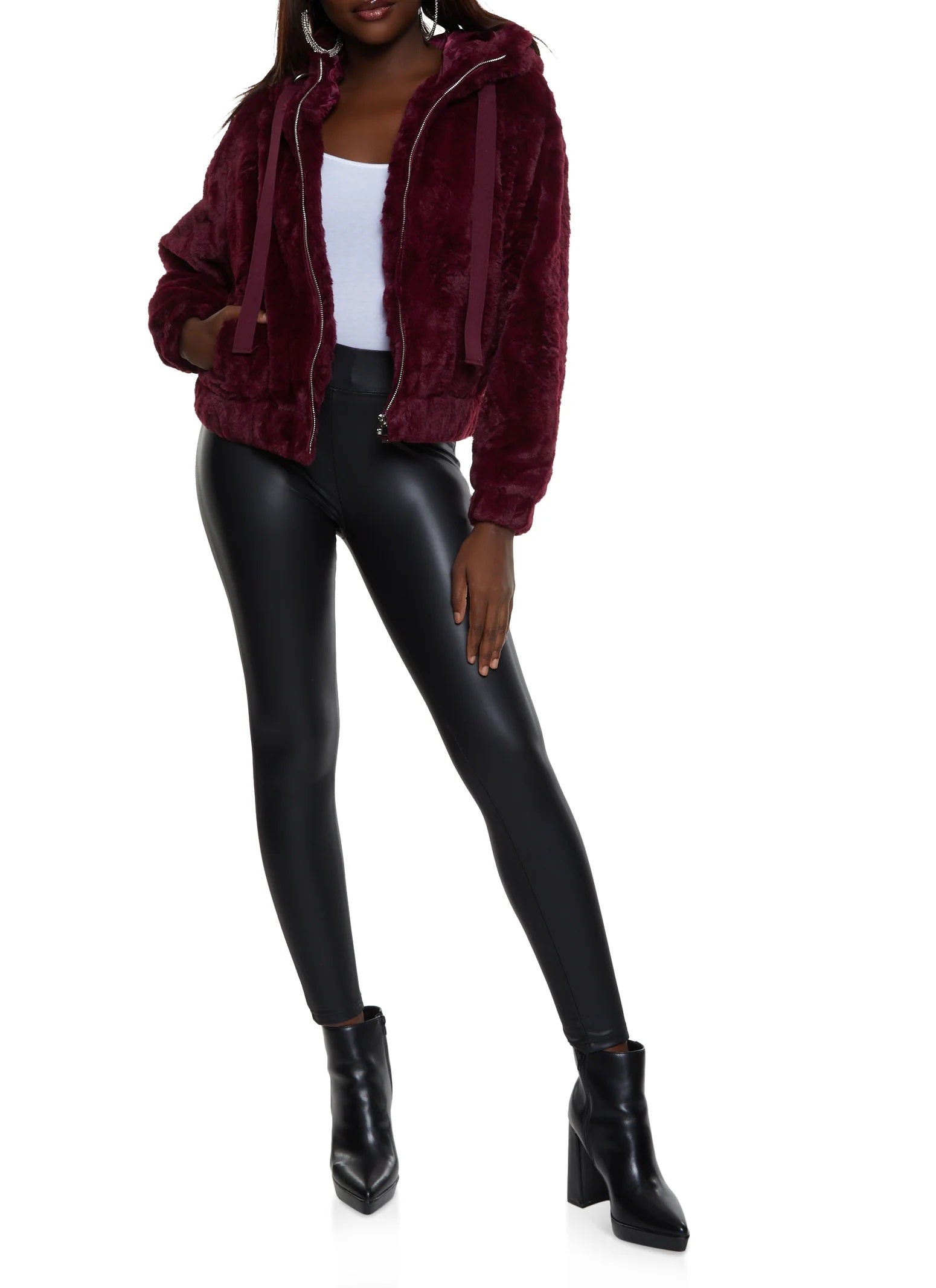 Almost Famous Women's Faux Fur Solid Zip up Jacket Wine Size Medium