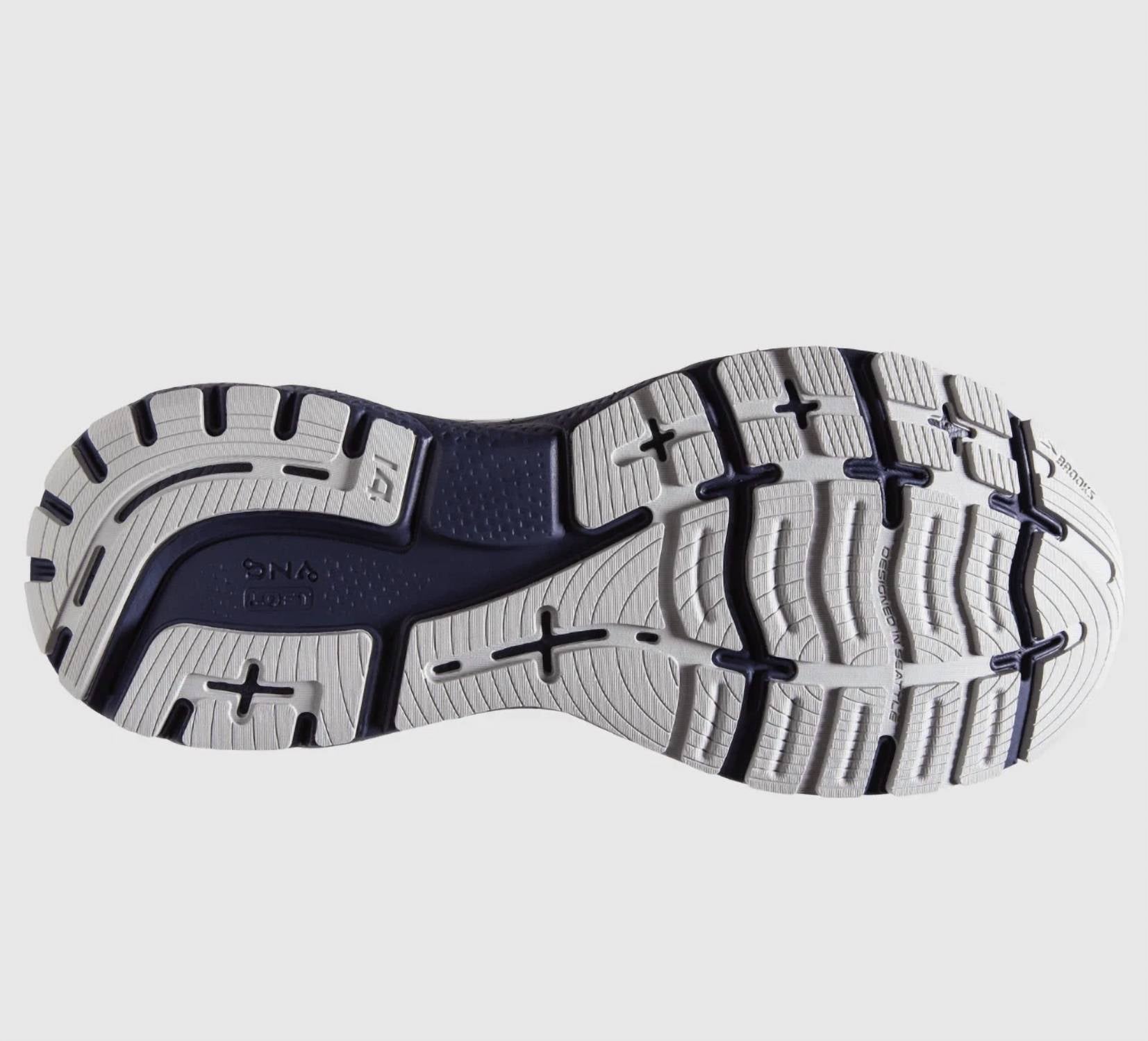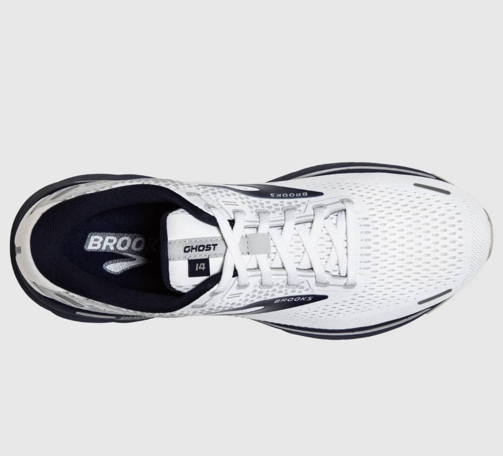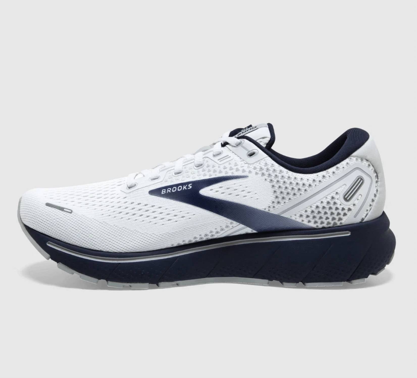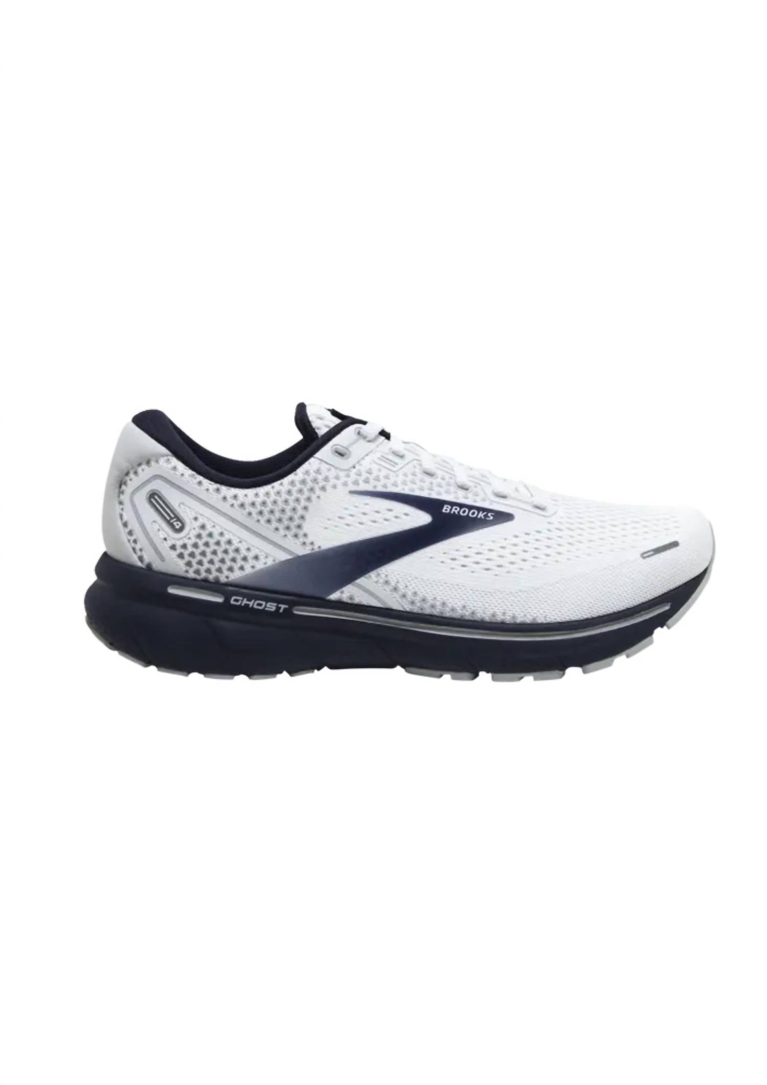 Introducing the Men's Ghost 14 Running Shoes by BROOKS, offering a seamless fusion of comfort and performance in a sleek white design. Engineered for the athleisure trend, these shoes feature an upper made from Nylon with 3D Fit Print technology, ensuring a breathable and secure fit. The midsole boasts 100% DNA Loft Cushioning for an exceptionally soft ride, complemented by a Segmented Crash Pad and Plush Transition Zone for smooth transitions from landing to toe-off. Perfect for fitness and workout sessions, the medium-width shoes with a round toe and wedge heel are ideal for neutral runners seeking a distraction-free experience.