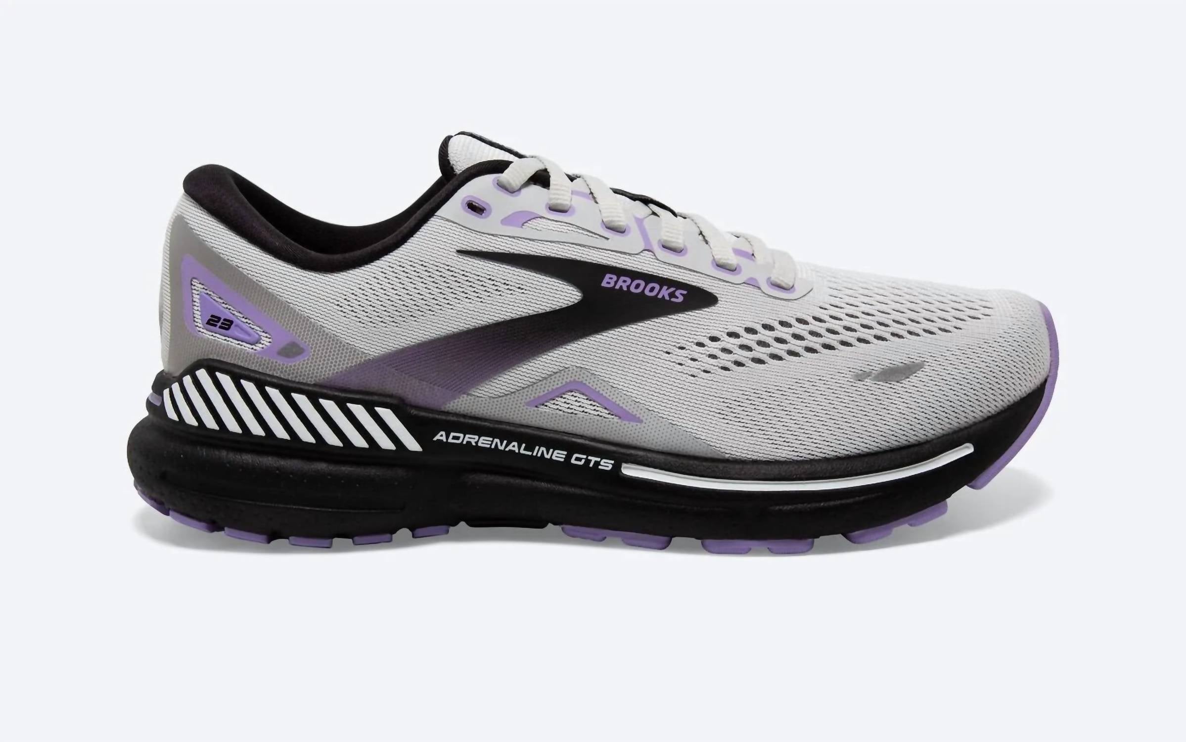 Workout in style with these adorable athletic sneakers. Step up your running game with the women's Adrenaline GTS 23 Running Shoes by BROOKS, offered in a sleek grey tone. Crafted from durable nylon, these shoes are designed with a round toe and a flat heel for superior comfort during fitness workouts. Engineered with a 12mm midsole drop and weighing just 9.1oz (258g), they feature an air mesh upper and DNA LOFT v2 cushioning for enhanced underfoot comfort and breathability. Perfect for summer athleisure, these shoes boast a classic fit with medium width, tailored for your fitness journey.