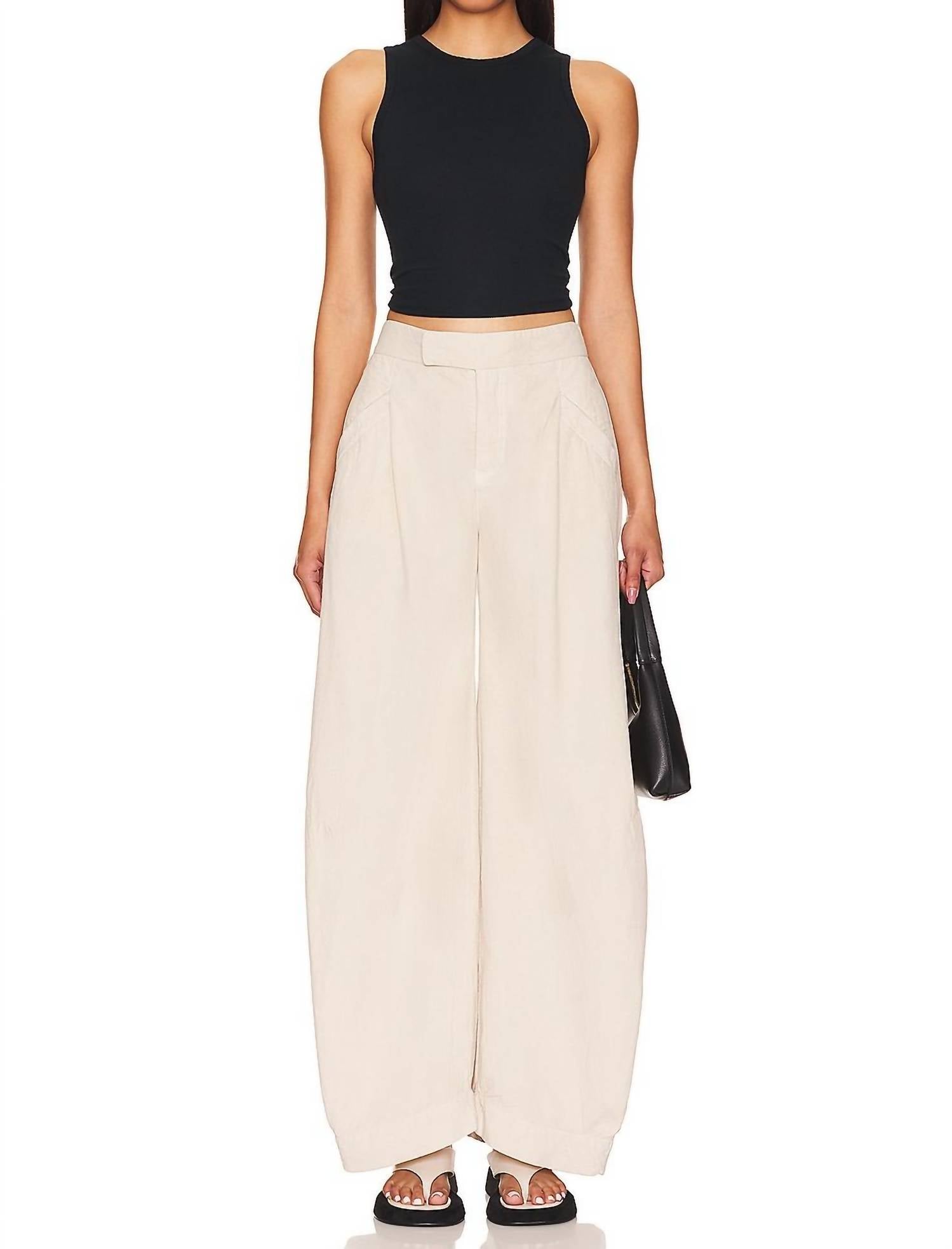 The Teagan Washed Barrel Trousers by Free People in Midnight Rain blend effortless chic with practicality. Made from 100% cotton, these wide-leg trousers offer a lightweight feel and feature a high-rise waist, front and back pockets, and a hook-and-eye closure. Machine washable for easy care. Key measurements for size 6: 30.5" waist, 43" hips, 12.25" rise, 28.5" inseam.