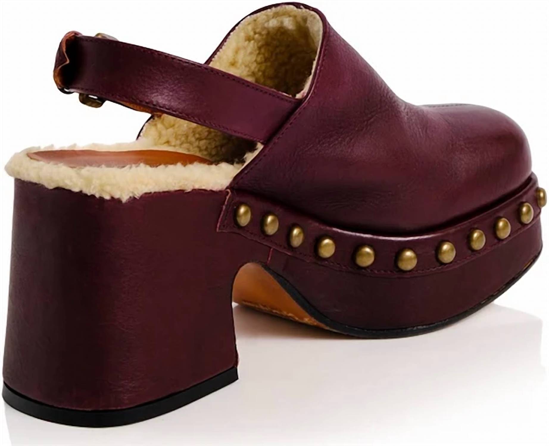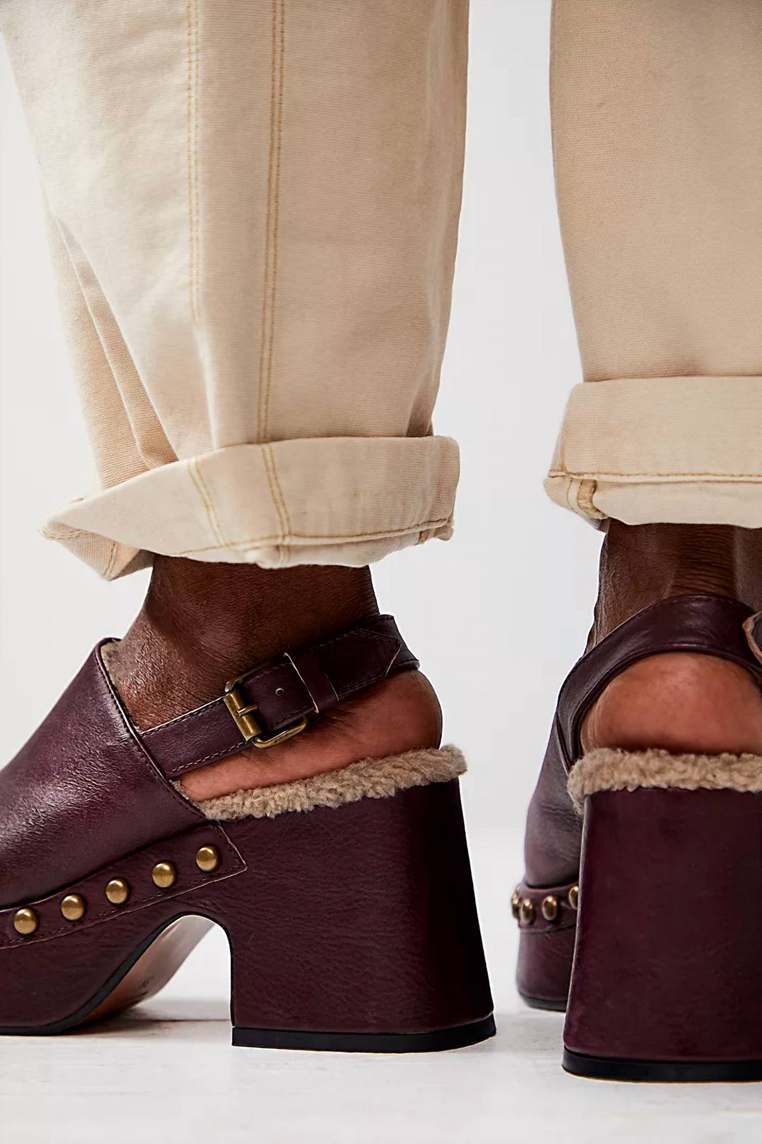 Introducing the Women's Autumn Studded Clog by Free People, a standout piece in your shoe collection. These on-trend clogs are designed with leather uppers and an eye-catching platform sole paired with a chunky block heel and stud accents. Featuring a convenient slip-on style with an adjustable buckle slingback strap and a faux sherpa-lined footbed for added comfort. Made in Italy, these clogs embody a perfect blend of style and craftsmanship, ideal for pairing with your favorite flared jeans. 3.5" block heel with platform.
