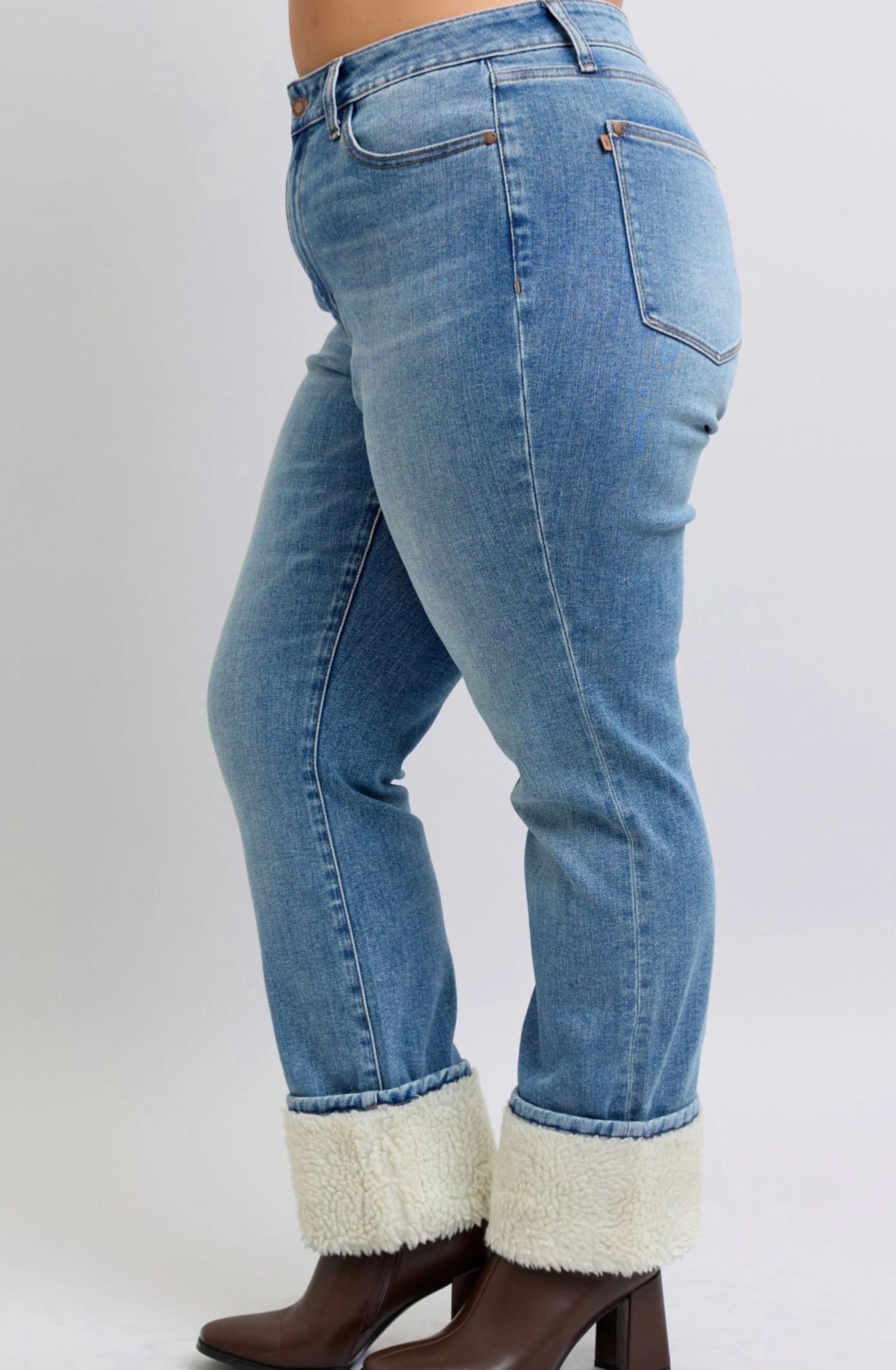 Pair these straight leg jeans with flats, sandals or even heels! You can't go wrong. Presenting the Judy Blue High Waist Shearling Cuffed Straight Leg Jean, a perfect blend of comfort and style. These classic-fit jeans feature a medium wash with a luxurious shearling cuff detail, accentuating their textured pattern. Made from a cotton blend, they boast a 12” high rise and inseam options of 30" cuffed or 35" uncuffed, ensuring a perfect fit for every woman. Designed with a button closure and practical pockets, these jeans promise shape retention and stretch for day-long comfort.