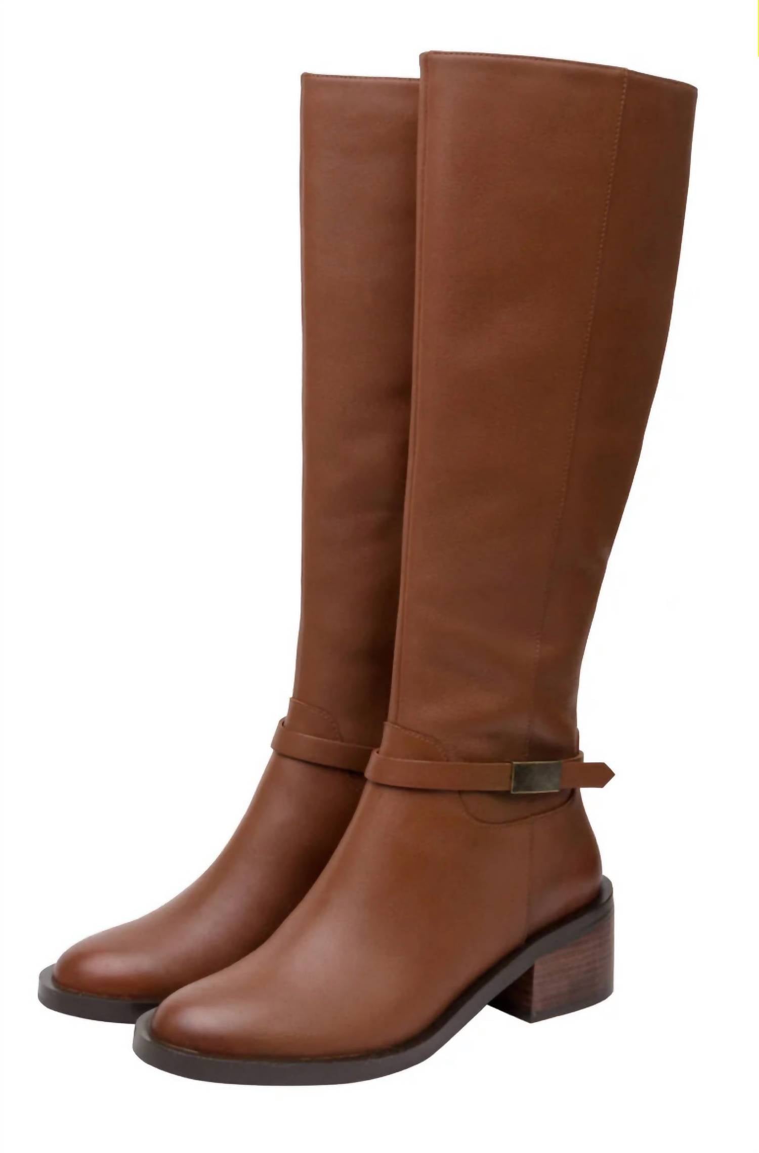 Elevate your fall wardrobe with the Women's Kamile Knee-high Riding Boots by Linea Paolo. Crafted in a rich cognac leather, these boots offer a fashionable yet practical low 1.75" block heel. They feature a convenient pull-on entry with an inside zipper closure, ensuring ease and comfort. The slip-resistant rubber outsole and cushioned synthetic lining provide added safety and support, while the approximate 15.5" shaft height and 13.75" topline circumference offer a classic silhouette. Perfect for holiday parties or workwear, these boots embody timeless elegance.
