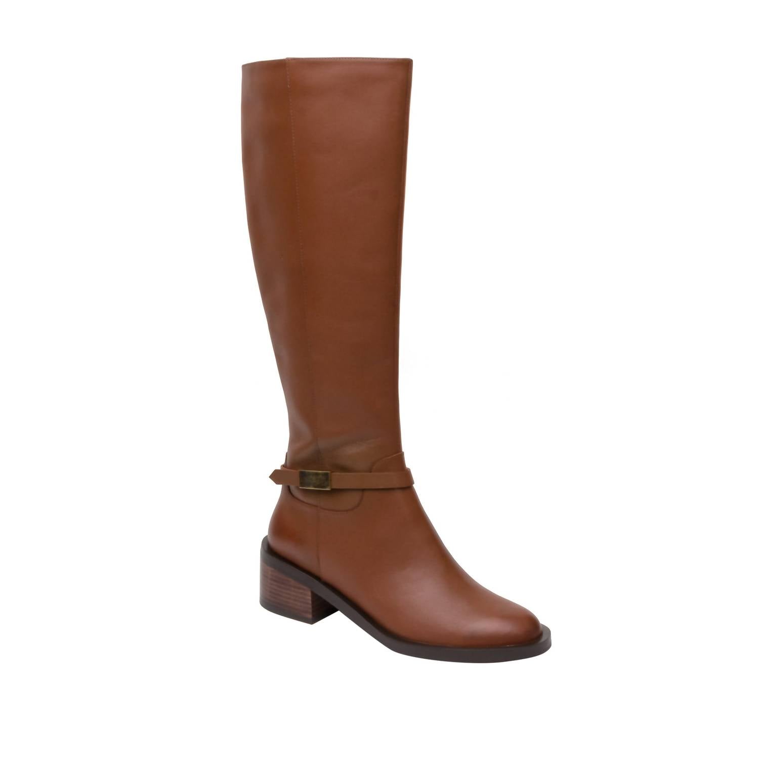 A stylish boot with a comfortable fit and the perfect amount of height. These classic boots are the perfect addition to any outfit and can be worn season after season. Elevate your fall wardrobe with the Women's Kamile Knee-high Riding Boots by Linea Paolo. Crafted in a rich cognac leather, these boots offer a fashionable yet practical low 1.75" block heel. They feature a convenient pull-on entry with an inside zipper closure, ensuring ease and comfort. The slip-resistant rubber outsole and cushioned synthetic lining provide added safety and support, while the approximate 15.5" shaft height and 13.75" topline circumference offer a classic silhouette. Perfect for holiday parties or workwear, these boots embody timeless elegance.