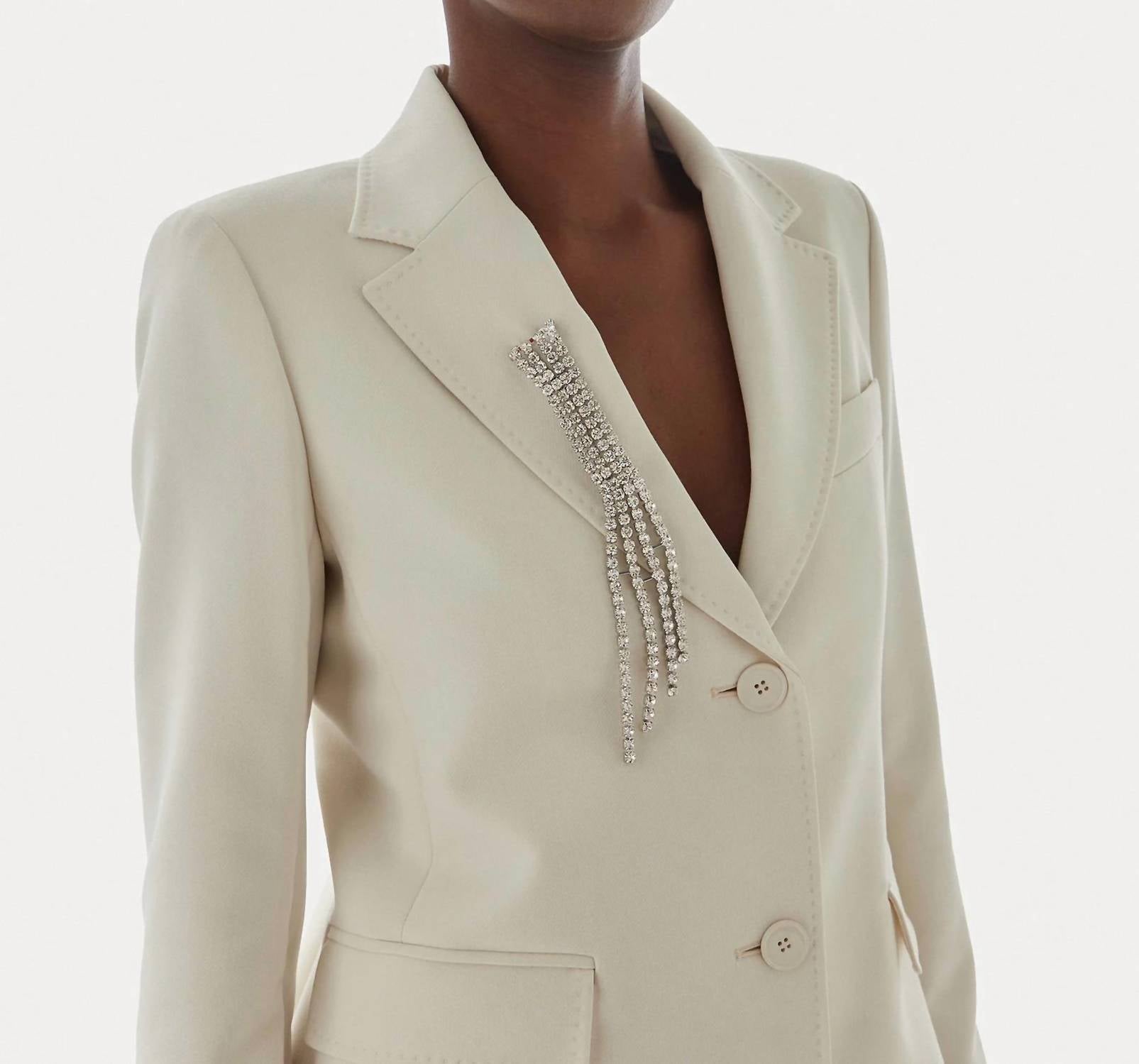 Elevate your ensemble with the Chandelier Brooch by MaxMara, a striking piece in elegant silver. This brooch features decorative zircons set in a sophisticated design crafted from metal and glass. Measuring 2.5 x 20 cm, it fastens with a classic safety pin for secure wear. A perfect accessory to add a touch of glamour to any outfit.